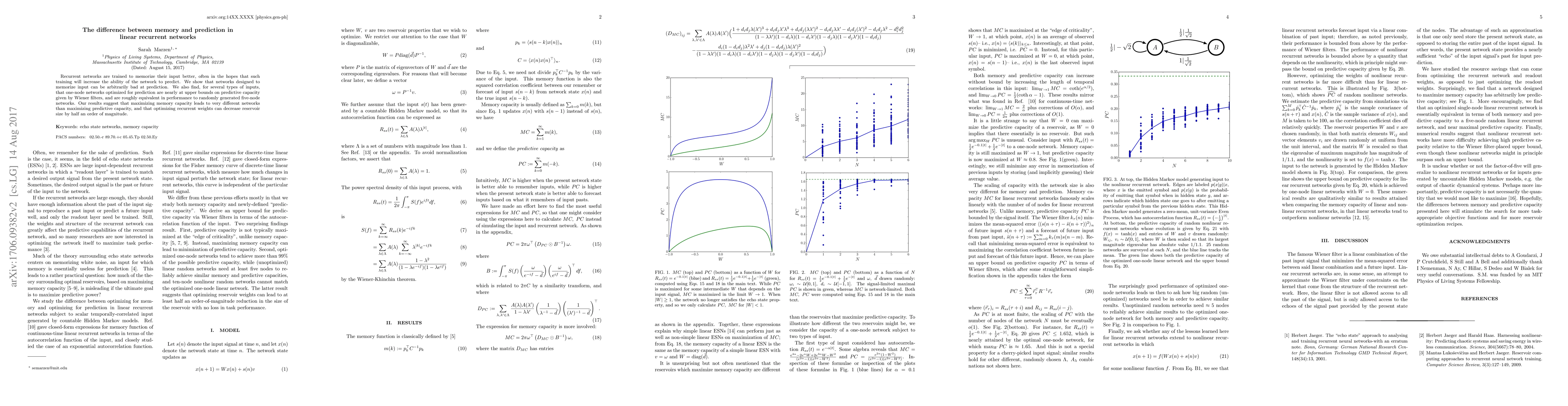 Recurrent networks are trained to memorize their input better, often in the hopes that such training will increase the ability of the network to predict. We show that networks designed to memorize input can be arbitrarily bad at prediction. We also find, for several types of inputs, that one-node networks optimized for prediction are nearly at upper bounds on predictive capacity given by Wiener filters, and are roughly equivalent in performance to randomly generated five-node networks. Our results suggest that maximizing memory capacity leads to very different networks than maximizing predictive capacity, and that optimizing recurrent weights can decrease reservoir size by half an order of magnitude.