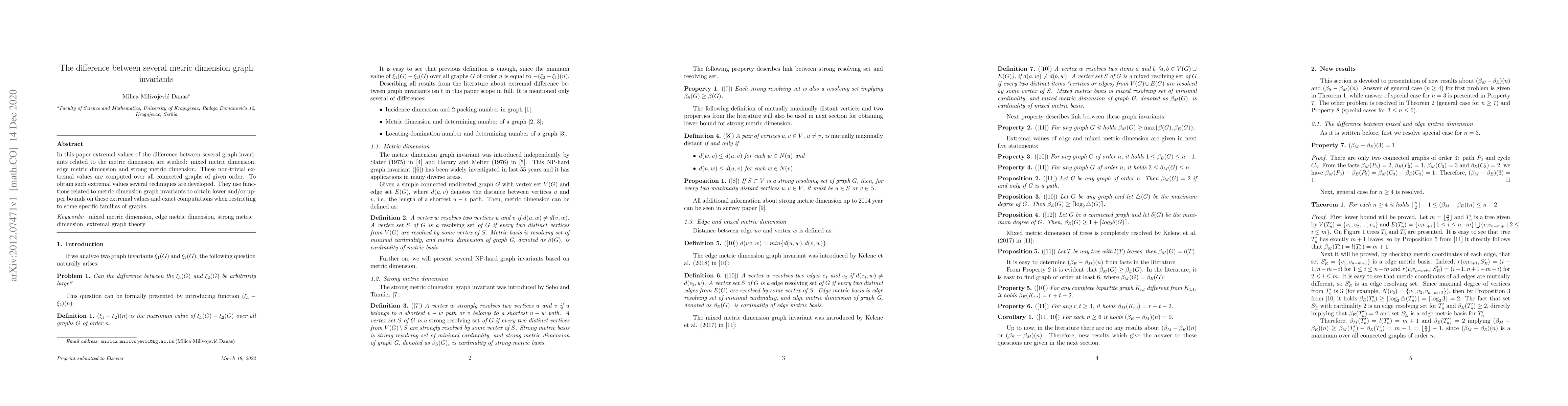In this paper extremal values of the difference between several graph invariants related to the metric dimension are studied: mixed metric dimension, edge metric dimension and strong metric dimension. These non-trivial extremal values are computed over all connected graphs of given order. To obtain such extremal values several techniques are developed. They use functions related to metric dimension graph invariants to obtain lower and/or upper bounds on these extremal values and exact computations when restricting to some specific families of graphs.