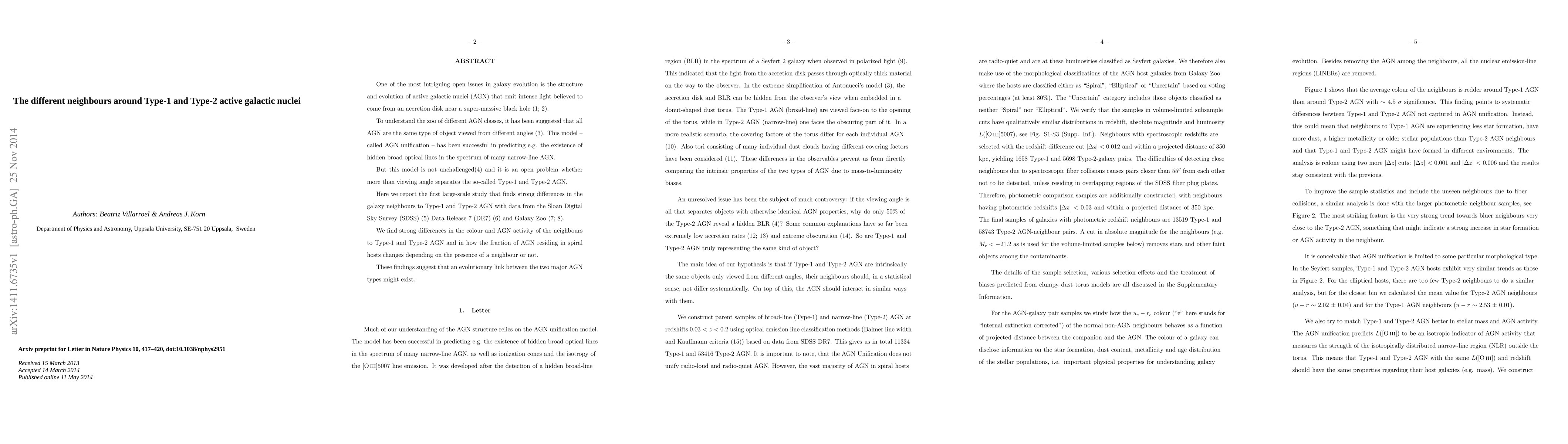 This study reveals significant differences in the neighbouring galaxies of Type-1 and Type-2 active galactic nuclei (AGN), suggesting an evolutionary link between the two types. Data from the Sloan Digital Sky Survey and Galaxy Zoo show that Type-1 and Type-2 AGN have distinct neighbouring galaxy characteristics, including colour and AGN activity.