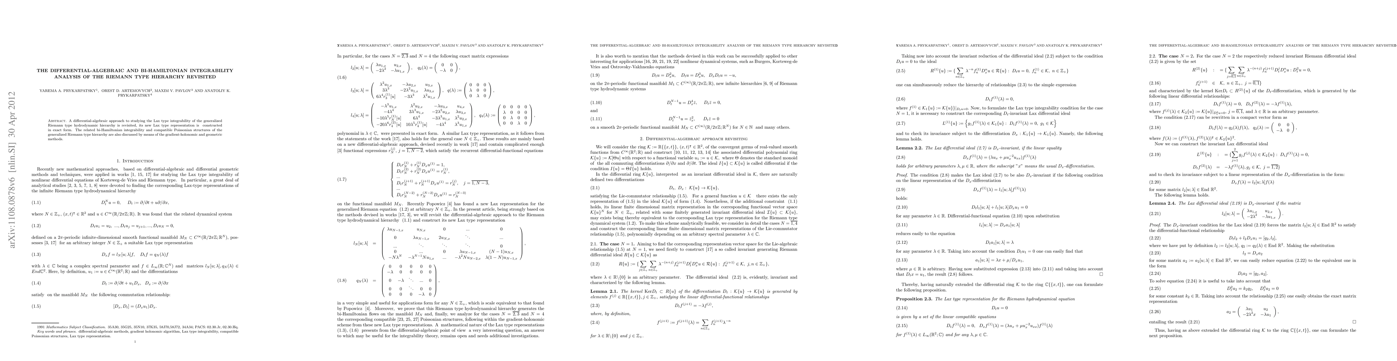 A differential-algebraic approach to studying the Lax type integrability of the generalized Riemann type hydrodynamic hierarchy is revisited, its new Lax type representation and Poisson structures constructed in exact form. The related bi-Hamiltonian integrability and compatible Poissonian structures of the generalized Riemann type hierarchy are also discussed.