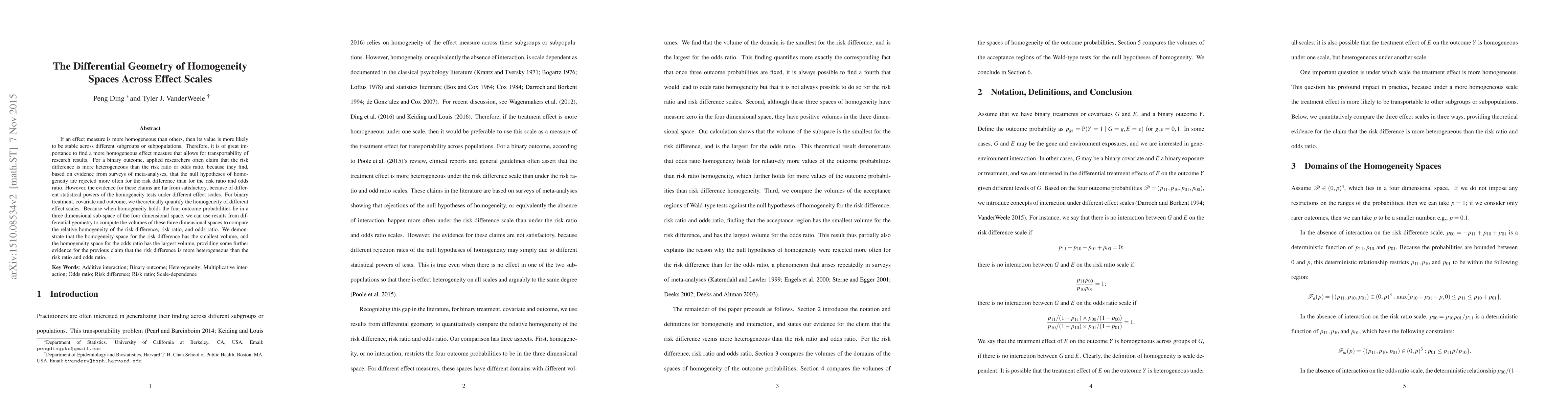 This paper theoretically quantifies the homogeneity of different effect scales for binary outcomes, using differential geometry to compare the volumes of three-dimensional subspaces where outcome probabilities lie. It finds that the risk difference has the smallest homogeneity space volume, while the odds ratio has the largest, supporting the claim that the risk difference is more heterogeneous than the risk ratio and odds ratio.