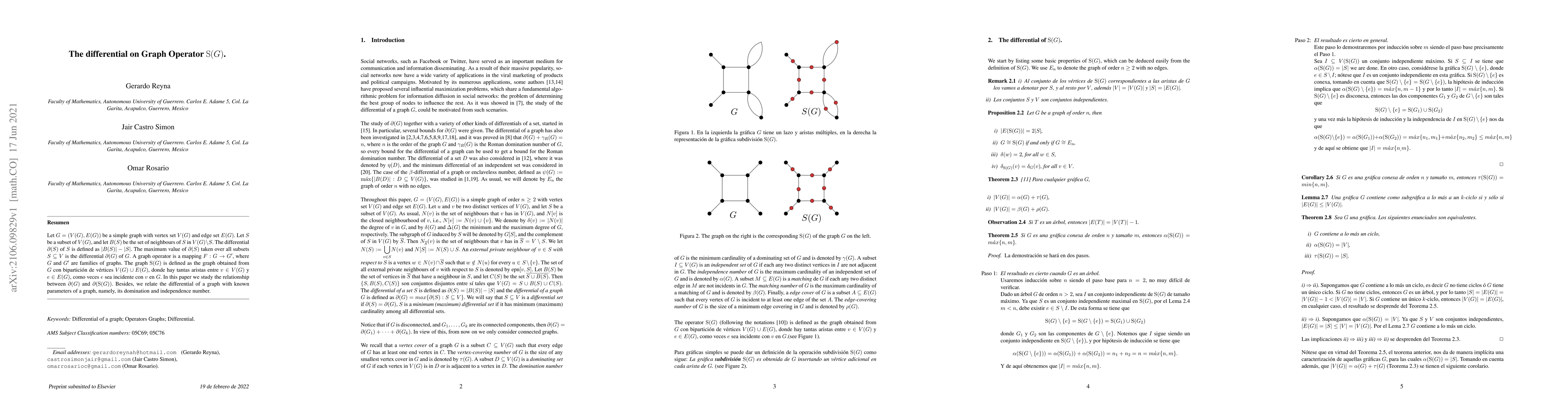 Let $G=(V(G),E(G))$ be a simple graph with vertex set $V(G)$ and edge set $E(G)$. Let $S$ be a subset of $V(G)$, and let $B(S)$ be the set of neighbours of $S$ in $V(G) \setminus S$. The differential $\partial(S)$ of $S$ is defined as $|B(S)|-|S|$. The maximum value of $\partial(S)$ taken over all subsets $S\subseteq V$ is the differential $\partial(G)$ of $G$. A graph operator is a mapping $F: G\rightarrow G'$, where $G$ and $G'$ are families of graphs.The graph $\S{G}$ is defined as the graph obtained from $G$ con bipartici\'on de v\'ertices $V(G)\cup E(G)$, donde hay tantas aristas entre $v \in V(G)$ y $e \in E(G)$, como veces $e$ sea incidente con $v$ en $G$. In this paper we study the relationship between $\partial(G)$ and $\partial(\S{G})$. Besides, we relate the differential of a graph with known parameters of a graph, namely, its domination and independence number.