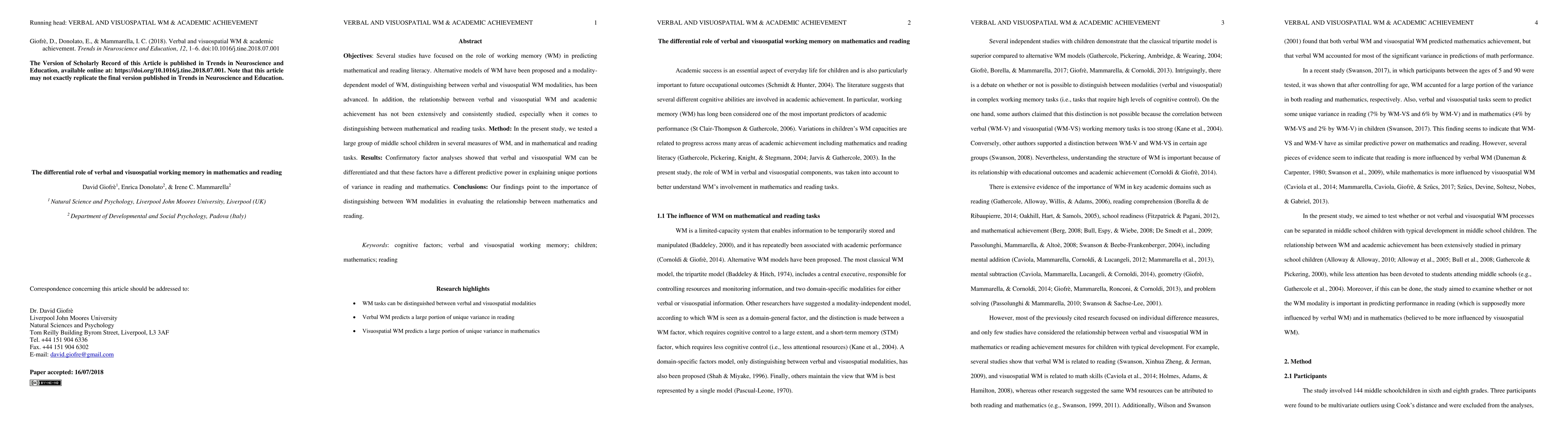 This study investigates the distinct roles of verbal and visuospatial working memory in predicting mathematical and reading literacy among middle school children. Results indicate that verbal and visuospatial working memory have unique predictive powers for reading and mathematics, respectively.