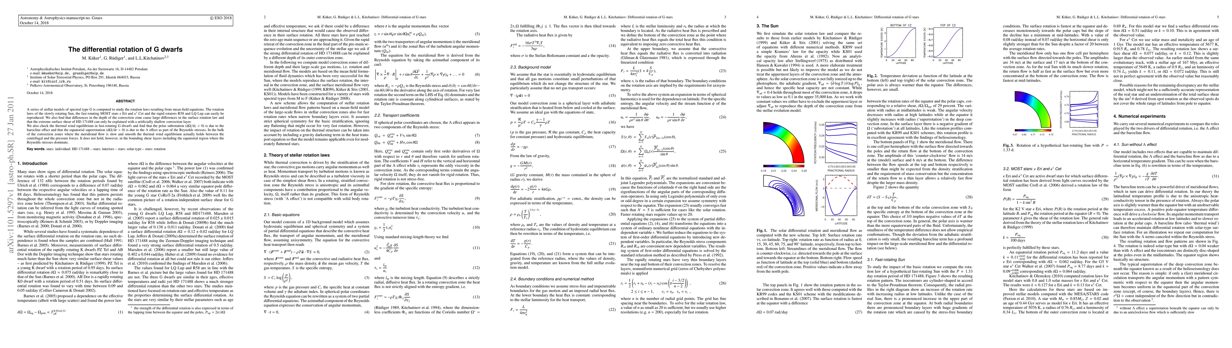 A series of stellar models of spectral type G is computed to study the rotation laws resulting from mean-field equations. The rotation laws of the slowly rotating Sun, the fast rotating MOST stars epsilon Eri and kappa1 Cet and the rapid rotators R58 and LQ Lup can easily be reproduced. We also find that differences in the depth of the convection zone cause large differences in the surface rotation law and that the extreme surface shear of HD 171488 can only be explained with a artificially shallow convection layer. We also check the thermal wind equilibrium in fast-rotating G dwarfs and find that the polar subrotation (dOmega/dz<0) is due to the barocline effect and that the equatorial superrotation (dOmega/dr>0) is due to the Lambda effect as part of the Reynolds stresses. In the bulk of the convection zones where the meridional flow is slow and smooth the thermal wind equilibrium actually holds between the centrifugal and the pressure forces. It does not hold, however, in the bounding shear layers including the equatorial region where the Reynolds stresses dominate.