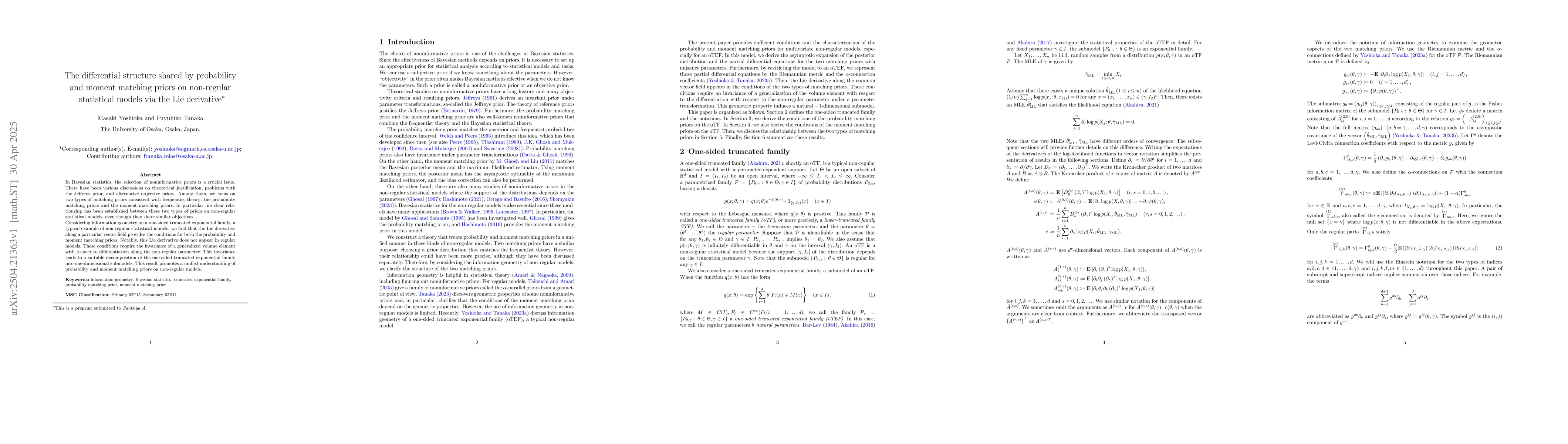 The paper introduces the use of Lie derivative conditions for both probability and moment matching priors, providing a unified framework for non-regular models.