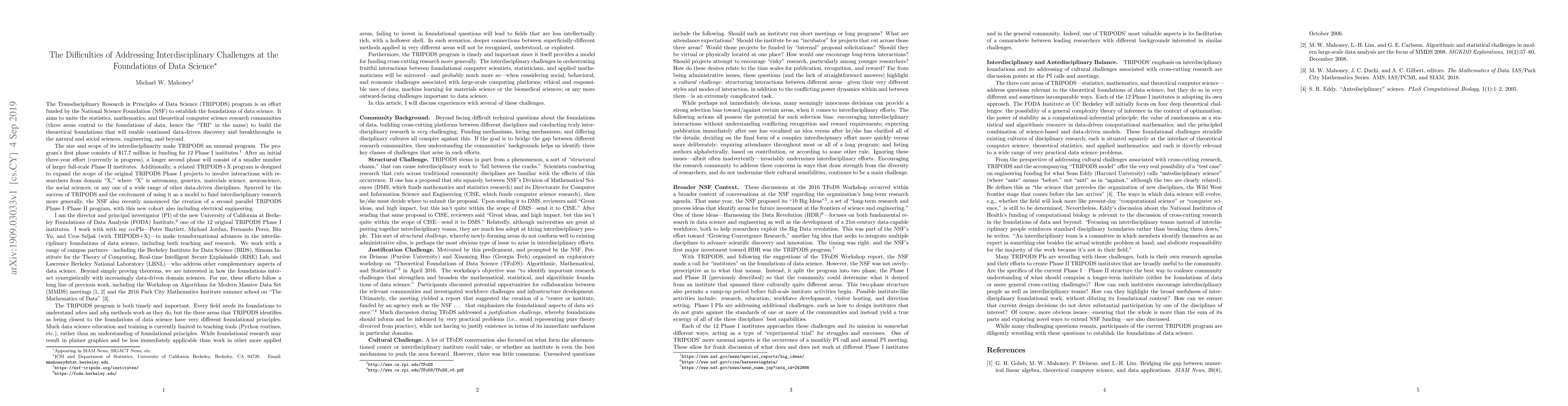 The National Science Foundation's Transdisciplinary Research in Principles of Data Science (TRIPODS) program aims to integrate three areas central to the foundations of data by uniting the statistics, mathematics, and theoretical computer science research communities. The program aims to provide a model for funding cross-cutting research and facilitating interactions among the three disciplines. Challenges associated with orchestrating fruitful interactions are described.