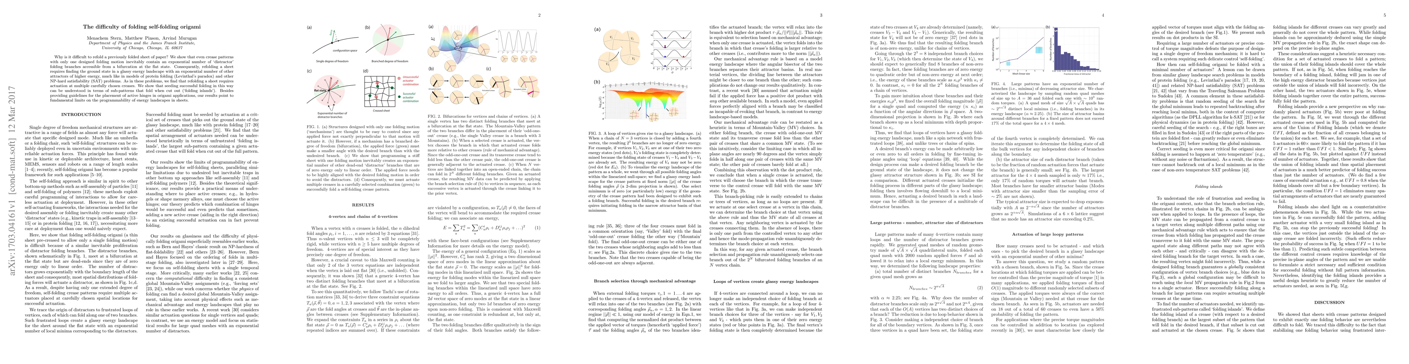 Why is it difficult to refold a previously folded sheet of paper? We show that even crease patterns with only one designed folding motion inevitably contain an exponential number of `distractor' folding branches accessible from a bifurcation at the flat state. Consequently, refolding a sheet requires finding the ground state in a glassy energy landscape with an exponential number of other attractors of higher energy, much like in models of protein folding (Levinthal's paradox) and other NP-hard satisfiability (SAT) problems. As in these problems, we find that refolding a sheet requires actuation at multiple carefully chosen creases. We show that seeding successful folding in this way can be understood in terms of sub-patterns that fold when cut out (`folding islands'). Besides providing guidelines for the placement of active hinges in origami applications, our results point to fundamental limits on the programmability of energy landscapes in sheets.