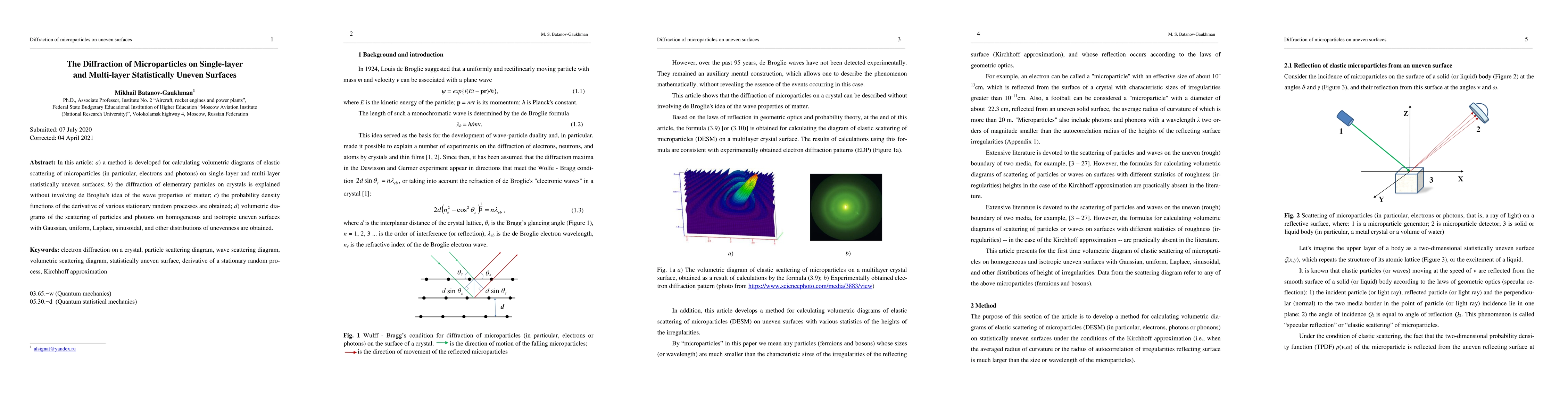 In this article: a) a method is developed for calculating volumetric diagrams of elastic scattering of microparticles (in particular, electrons and photons) on single-layer and multi-layer statistically uneven surfaces; b) the diffraction of elementary particles on crystals is explained without involving de Broglie's idea of the wave properties of matter; c) the probability density functions of the derivative of various stationary random processes are obtained; d) volumetric diagrams of the scattering of particles and photons on homogeneous and isotropic uneven surfaces with Gaussian, uniform, Laplace, sinusoidal, and other distributions of unevenness are obtained.