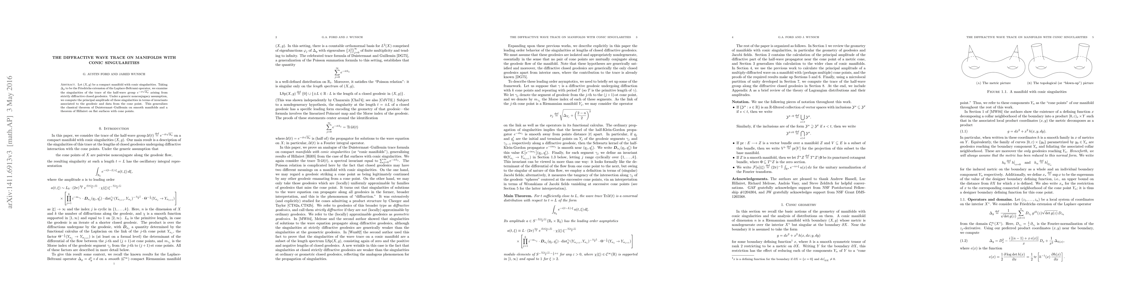 This paper investigates the diffractive wave trace on compact manifolds with conic singularities, analyzing the singularities arising from strictly diffractive closed geodesics. It computes the principal amplitude of these singularities using invariants tied to the geodesic and cone point data, generalizing previous results for smooth and flat surfaces.