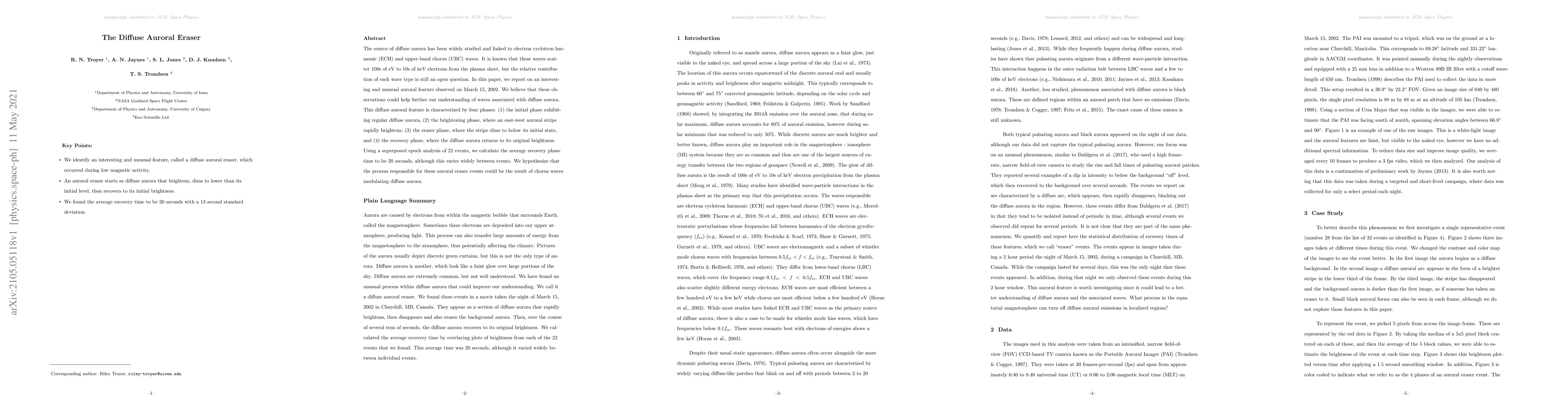 The source of diffuse aurora has been widely studied and linked to electron cyclotron harmonic (ECH) and upper-band chorus (UBC) waves. It is known that these waves scatter 100s of eV to 10s of keV electrons from the plasma sheet, but the relative contribution of each wave type is still an open question. In this paper, we report on an interesting and unusual auroral feature observed on March 15, 2002. We believe that these observations could help further our understanding of waves associated with diffuse aurora. This diffuse auroral feature is characterized by four phases: (1) the initial phase exhibiting regular diffuse aurora, (2) the brightening phase, where an east-west auroral stripe rapidly brightens, (3) the eraser phase, where the stripe dims to below its initial state, and (4) the recovery phase, where the diffuse aurora returns to its original brightness. Using a superposed epoch analysis of 22 events, we calculate the average recovery phase time to be 20 seconds, although this varies widely between events. We hypothesize that the process responsible for these auroral eraser events could be the result of chorus waves modulating diffuse aurora.