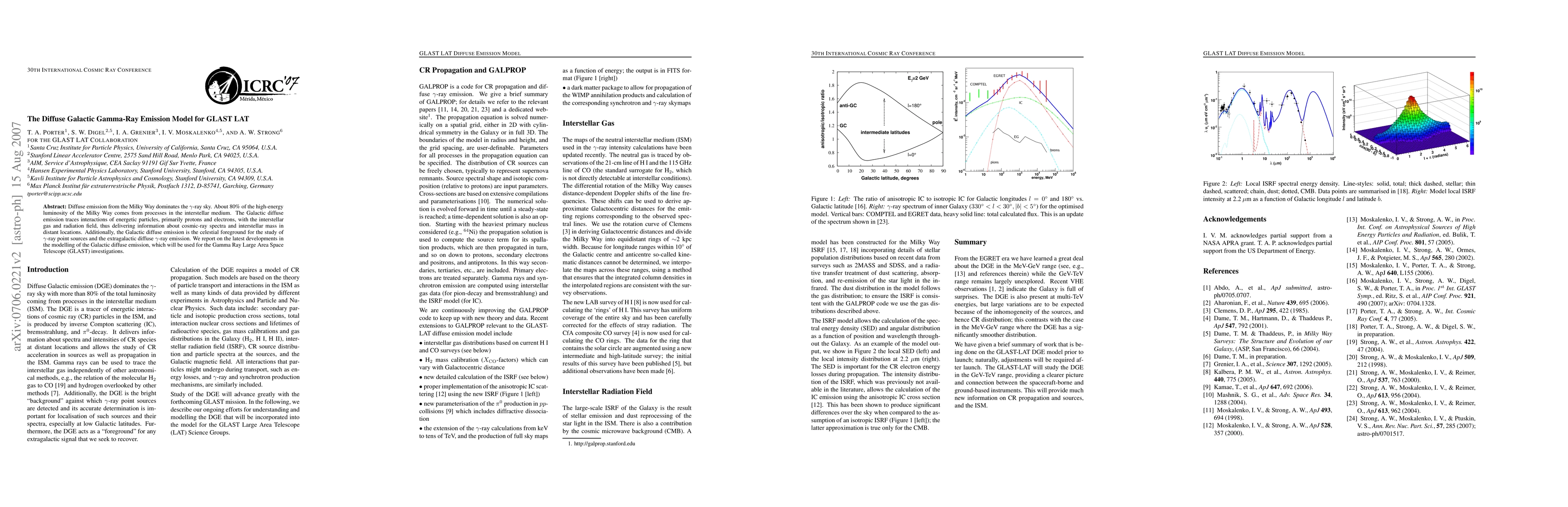 This paper presents the latest model for the Galactic diffuse gamma-ray emission, which primarily results from interactions between energetic particles and the interstellar medium, providing insights into cosmic-ray spectra and interstellar mass. This model is crucial for the Gamma Ray Large Area Space Telescope (GLAST) to accurately study gamma-ray point sources and extragalactic diffuse gamma-ray emission.
