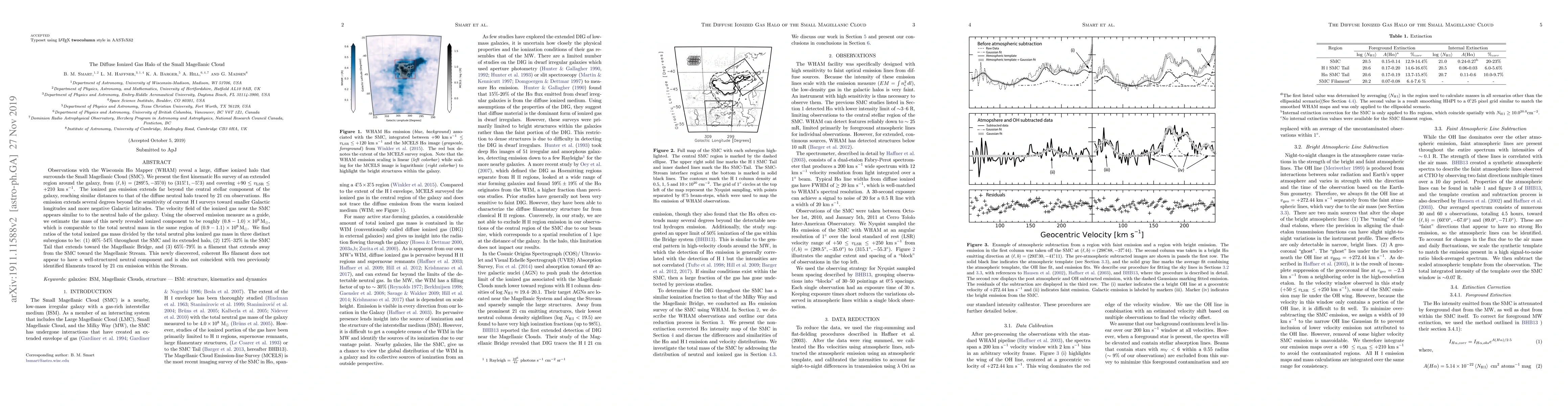 The WHAM survey reveals a large, diffuse ionized gas halo surrounding the Small Magellanic Cloud (SMC), extending beyond its central stellar component and comparable in mass to the neutral gas. The ionized gas exhibits a velocity field similar to the neutral halo, with notable variations in the SMC Tail and a distinct filament.