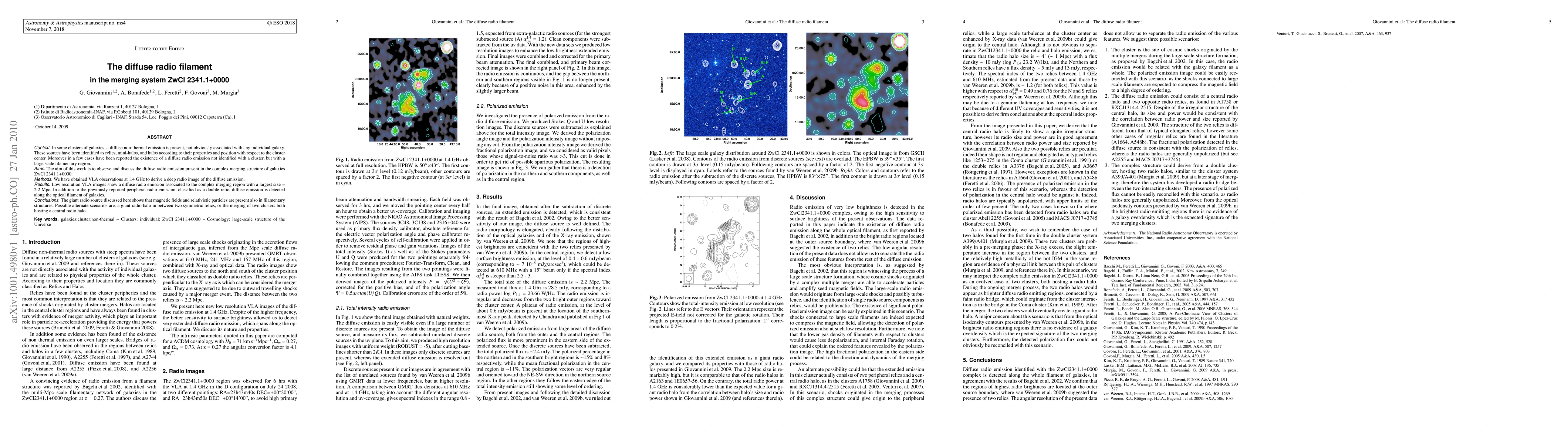 This paper investigates the diffuse radio emission in the merging galaxy cluster ZwCl 2341.1+0000, revealing a large-scale filamentary structure with a size of 2.2 Mpc, suggesting the presence of magnetic fields and relativistic particles in filamentary regions, potentially indicating a giant radio halo or merging clusters each with a central radio halo.