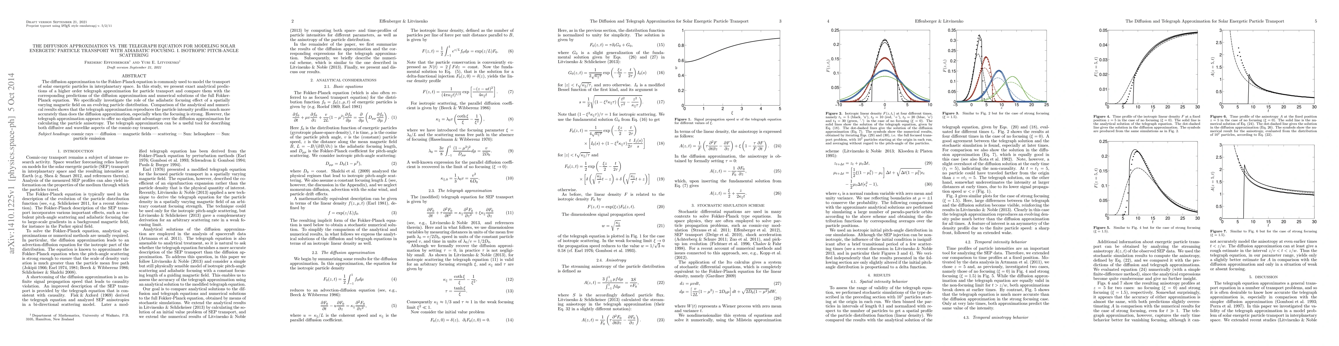This paper compares the diffusion approximation and a higher-order telegraph equation for modeling solar energetic particle transport, finding that the telegraph approximation more accurately reproduces particle intensity profiles, especially under strong adiabatic focusing, while offering no significant advantage for calculating particle anisotropy.