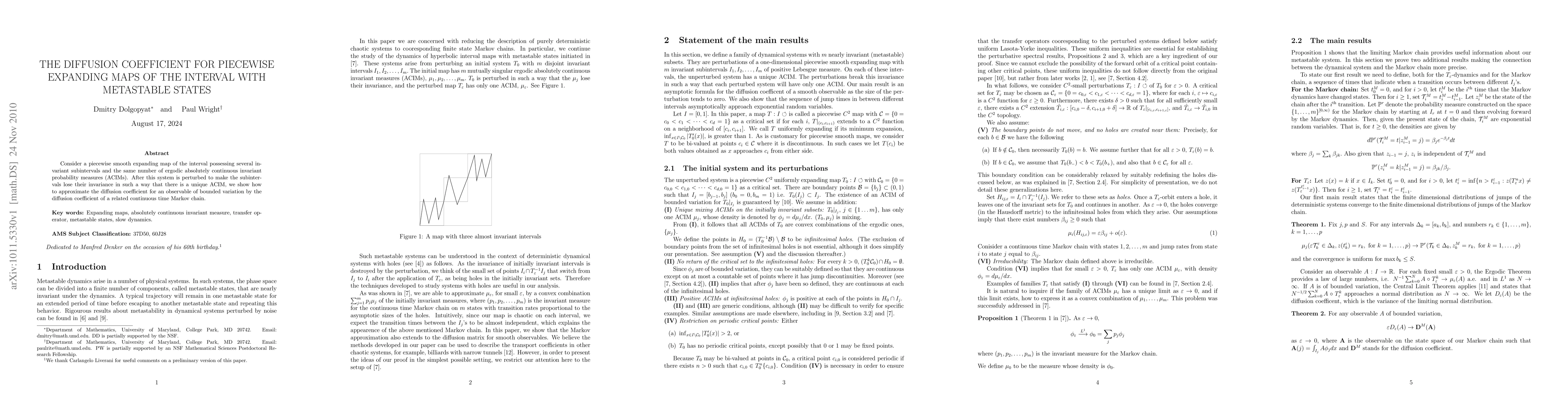 This research approximates the diffusion coefficient for a perturbed piecewise expanding interval map with metastable states using a related continuous time Markov chain, demonstrating a method to analyze complex dynamical systems.