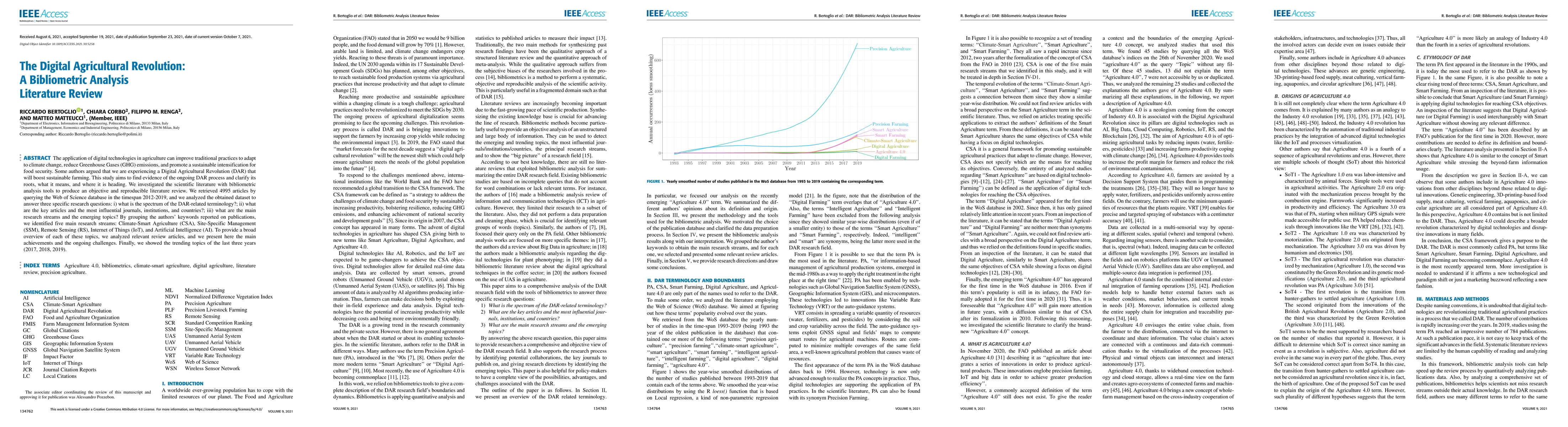 This study conducts a bibliometric analysis of 4995 articles from 2012-2019 to explore the Digital Agricultural Revolution (DAR) and its implications for sustainable farming, identifying key research streams and influential contributors. The main streams include Climate-Smart Agriculture, Site-Specific Management, Remote Sensing, Internet of Things, and Artificial Intelligence.