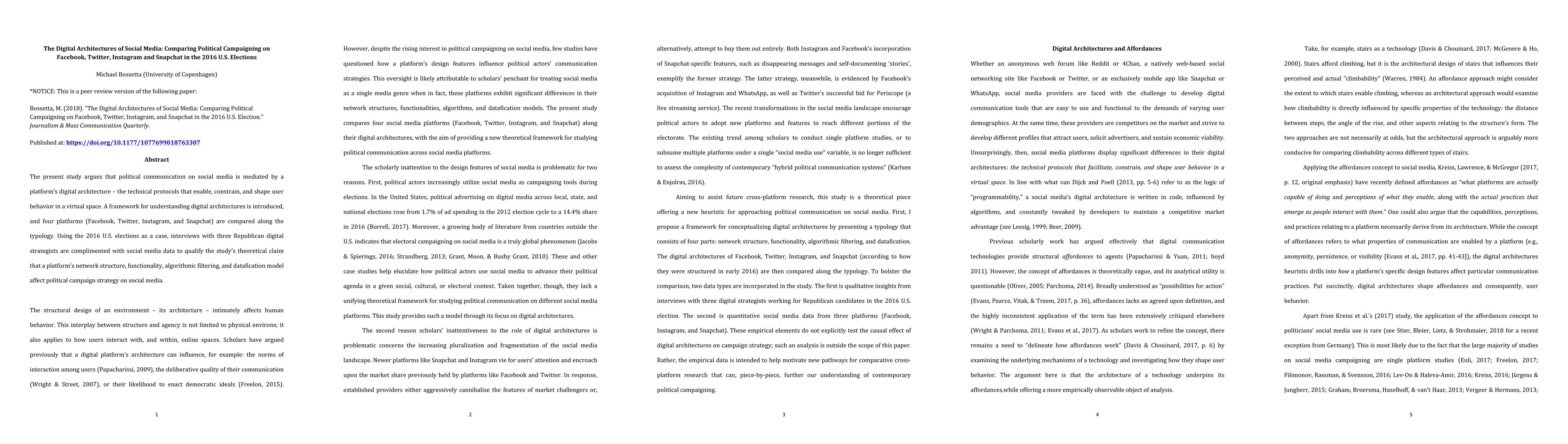 This study examines how the digital architectures of Facebook, Twitter, Instagram, and Snapchat shape political campaigning during the 2016 U.S. election. It introduces a framework to analyze the technical protocols that influence user behavior, revealing how platform-specific features affect campaign strategies.