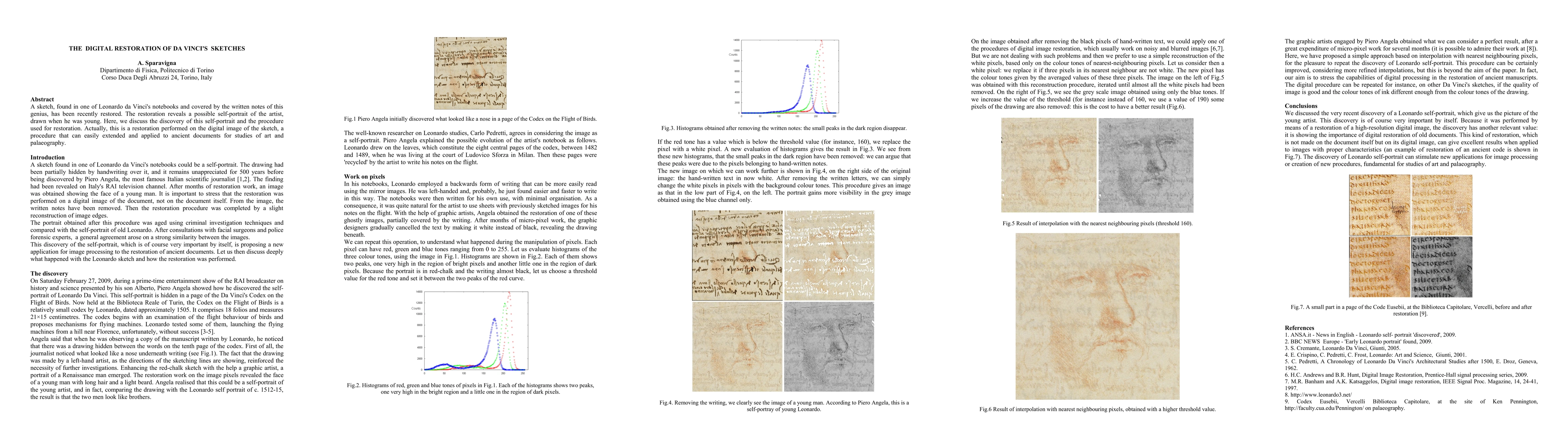 This paper discusses the digital restoration of a hidden sketch in Leonardo da Vinci's notebook, revealing a potential self-portrait. The study outlines the restoration process and its potential applications for ancient documents in art and palaeography.