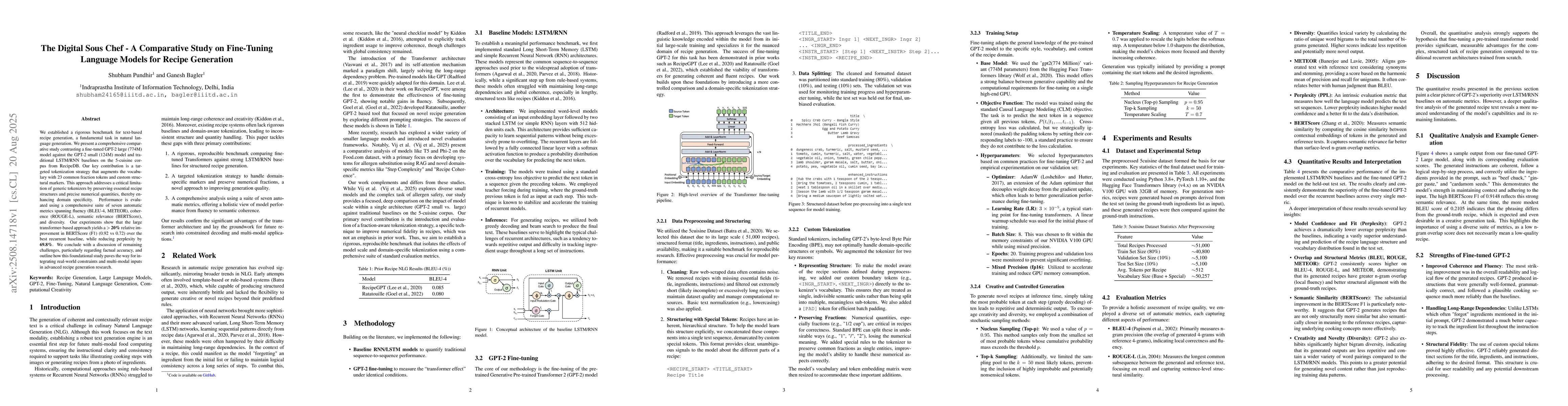The research establishes a benchmark for text-based recipe generation using a fine-tuned GPT-2 large (774M) model, contrasting it with GPT-2 small (124M) and LSTM/RNN baselines on the 5-cuisine corpus from RecipeDB. A targeted tokenization strategy is employed, augmenting the vocabulary with 23 common fraction tokens and custom structural markers to preserve essential recipe structures and precise numerical quantities.