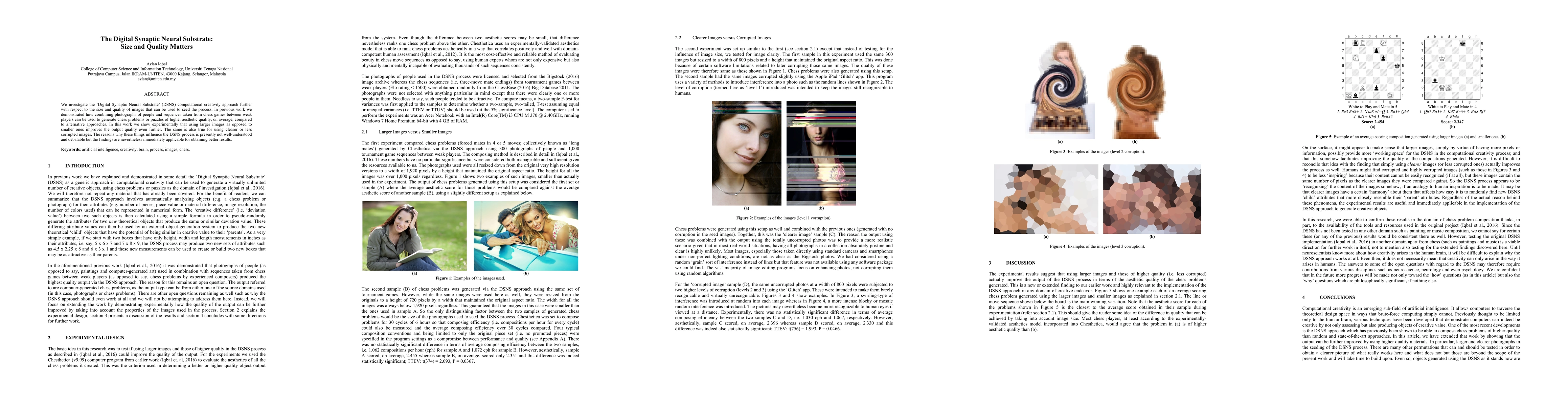 We investigate the 'Digital Synaptic Neural Substrate' (DSNS) computational creativity approach further with respect to the size and quality of images that can be used to seed the process. In previous work we demonstrated how combining photographs of people and sequences taken from chess games between weak players can be used to generate chess problems or puzzles of higher aesthetic quality, on average, compared to alternative approaches. In this work we show experimentally that using larger images as opposed to smaller ones improves the output quality even further. The same is also true for using clearer or less corrupted images. The reasons why these things influence the DSNS process is presently not well-understood and debatable but the findings are nevertheless immediately applicable for obtaining better results.