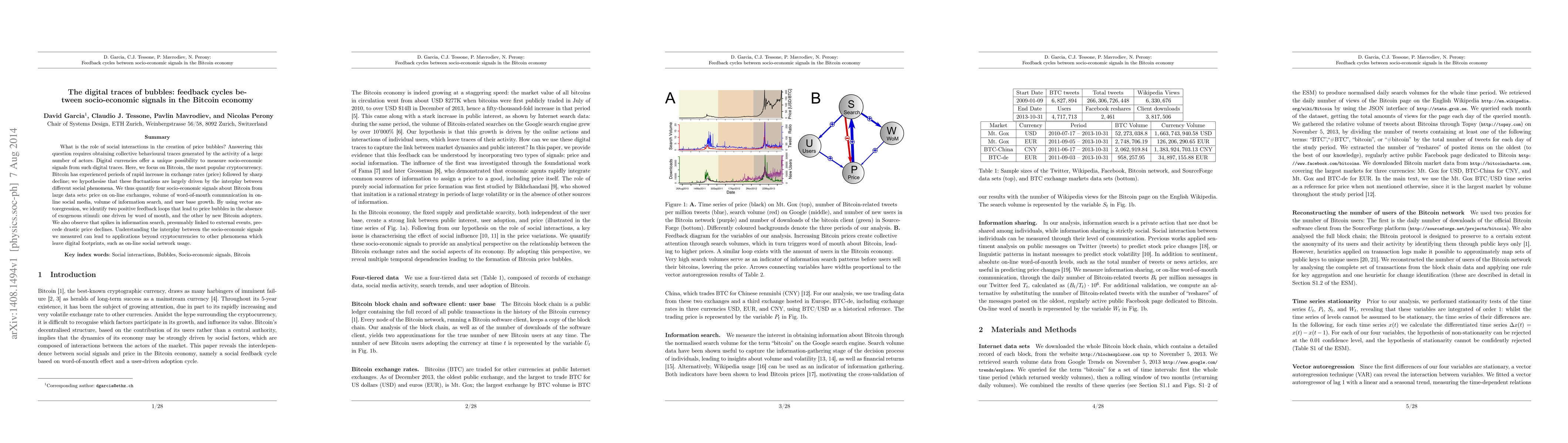 What is the role of social interactions in the creation of price bubbles? Answering this question requires obtaining collective behavioural traces generated by the activity of a large number of actors. Digital currencies offer a unique possibility to measure socio-economic signals from such digital traces. Here, we focus on Bitcoin, the most popular cryptocurrency. Bitcoin has experienced periods of rapid increase in exchange rates (price) followed by sharp decline; we hypothesise that these fluctuations are largely driven by the interplay between different social phenomena. We thus quantify four socio-economic signals about Bitcoin from large data sets: price on on-line exchanges, volume of word-of-mouth communication in on-line social media, volume of information search, and user base growth. By using vector autoregression, we identify two positive feedback loops that lead to price bubbles in the absence of exogenous stimuli: one driven by word of mouth, and the other by new Bitcoin adopters. We also observe that spikes in information search, presumably linked to external events, precede drastic price declines. Understanding the interplay between the socio-economic signals we measured can lead to applications beyond cryptocurrencies to other phenomena which leave digital footprints, such as on-line social network usage.