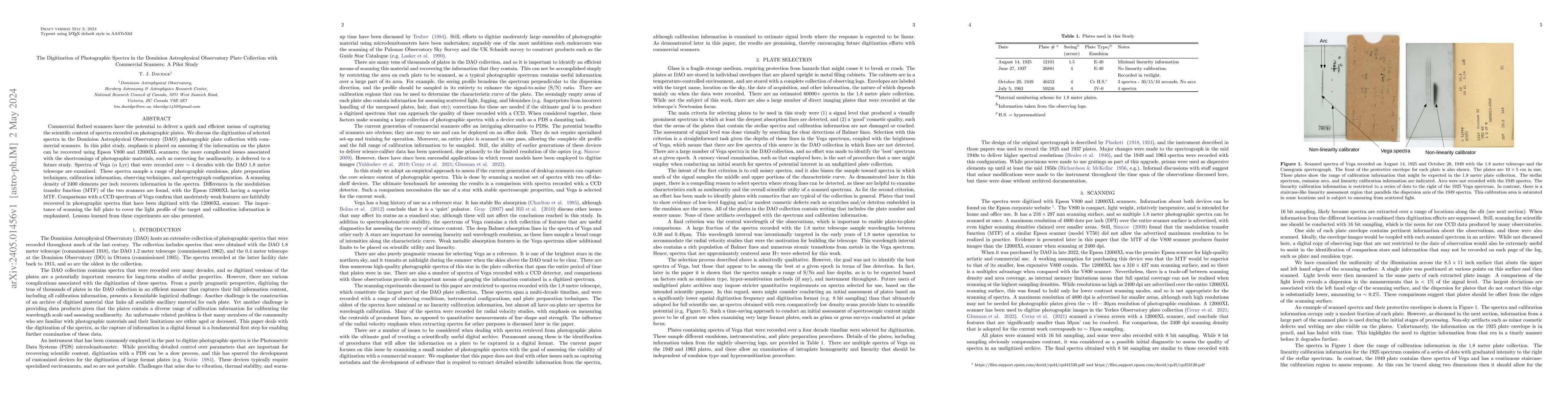 This pilot study assesses the digitization of photographic spectra from the Dominion Astrophysical Observatory using commercial Epson scanners, finding that the Epson 12000XL outperforms the V800 in modulation transfer function and faithfully recovers moderately weak spectral features. The study emphasizes the need for full plate scanning to cover light profiles and calibration data.