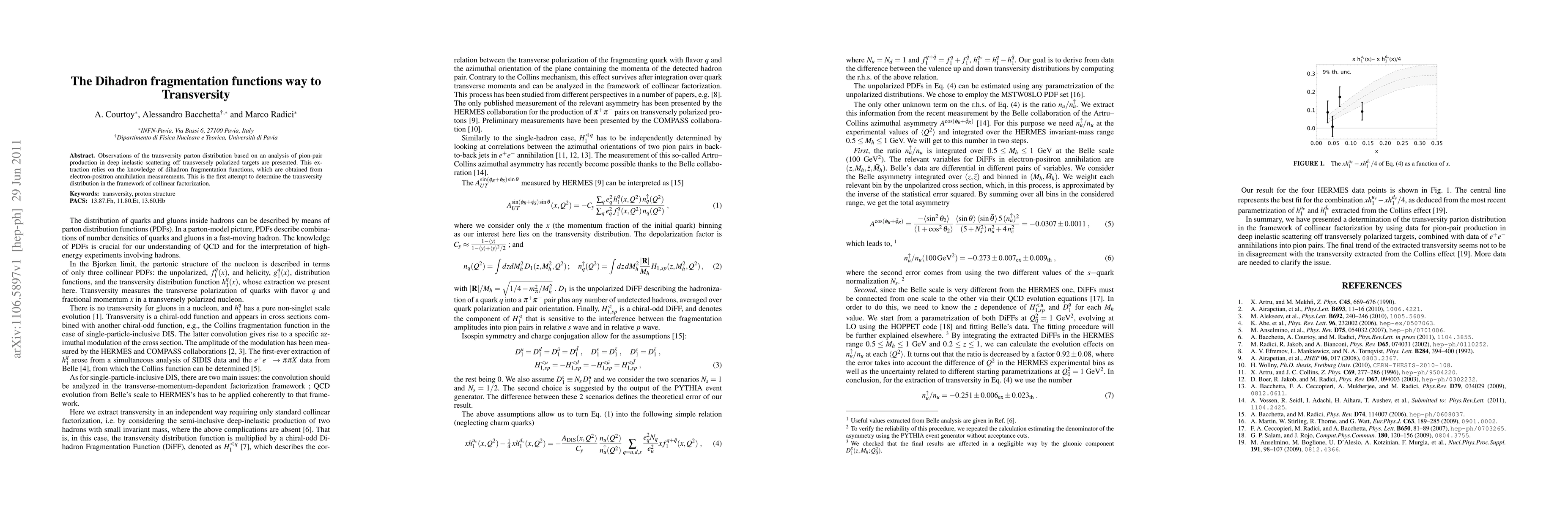 This paper presents the first extraction of the transversity parton distribution through pion-pair production analysis in deep inelastic scattering using transversely polarized targets, relying on dihadron fragmentation functions derived from electron-positron annihilation measurements within collinear factorization.