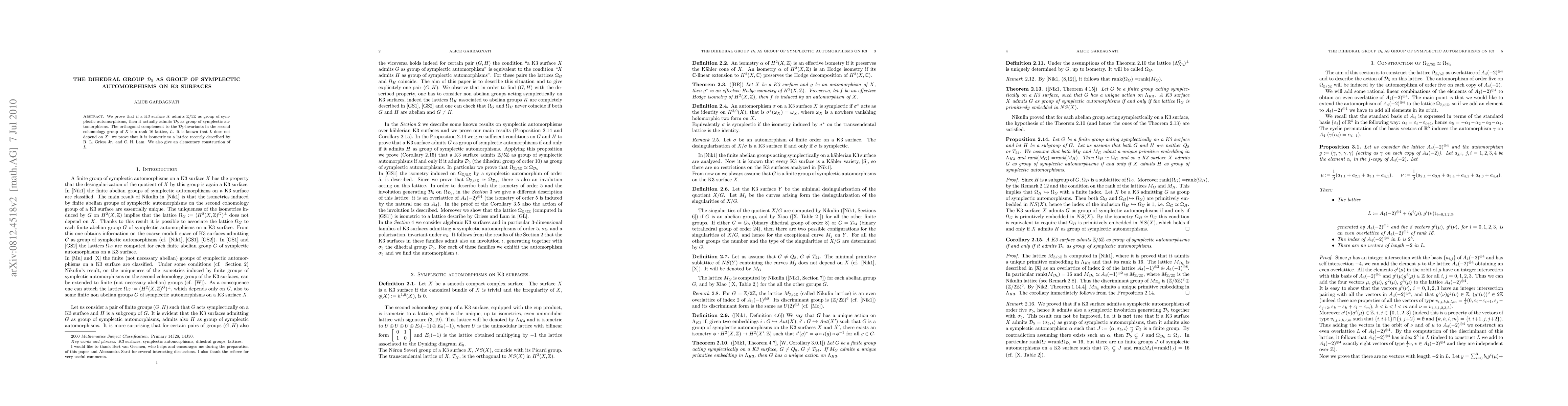Summary: This paper demonstrates that K3 surfaces with a $\Z/5\Z$ symplectic automorphism group actually have $\Dh_5$ automorphisms. It establishes the existence of a rank 16 lattice $L$ in the orthogonal complement of $\Dh_5$-invariants in $X$'s second cohomology, showing its isometry to a lattice described by Griess and Lam.