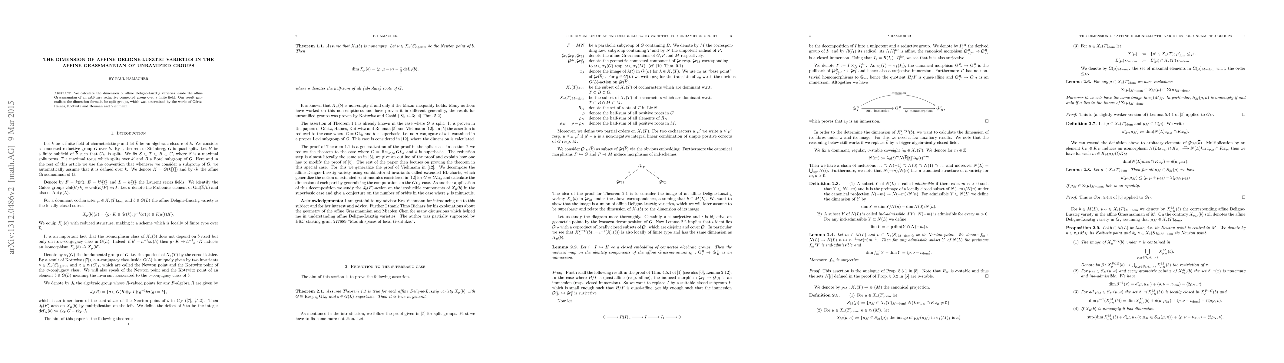 This paper calculates the dimension of affine Deligne-Lusztig varieties within the affine Grassmannian of unramified groups. It also explores the irreducible components of these varieties in the superbasic case and the action of $J_b(F)$ on them.