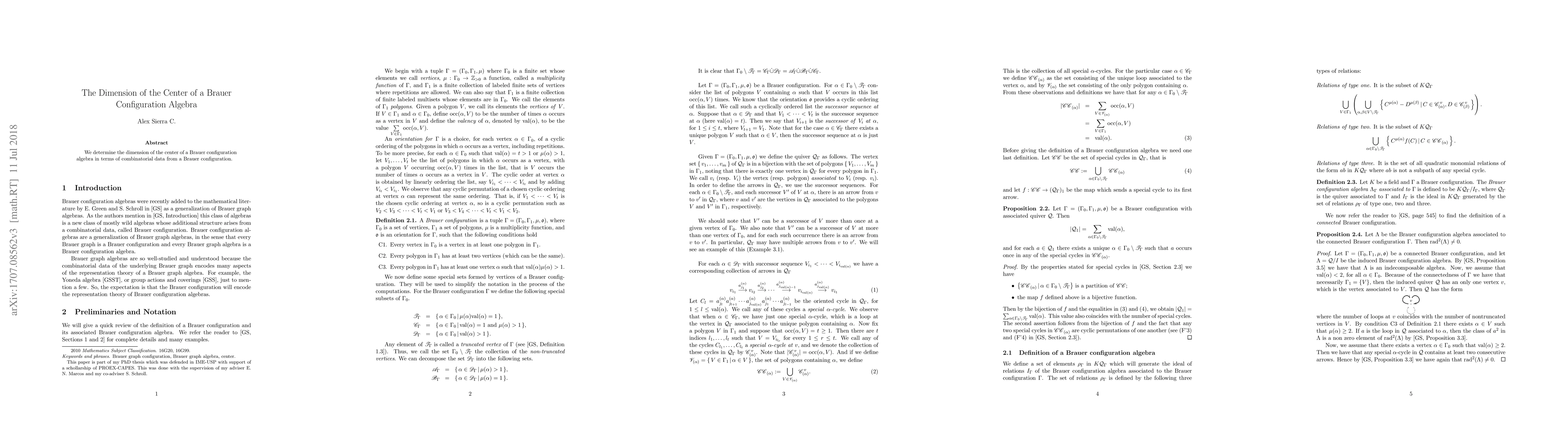 We consider an arbitrary algebra of the class of Brauer configuration algebras and calculate the dimension of the center by determining a $K$-basis.