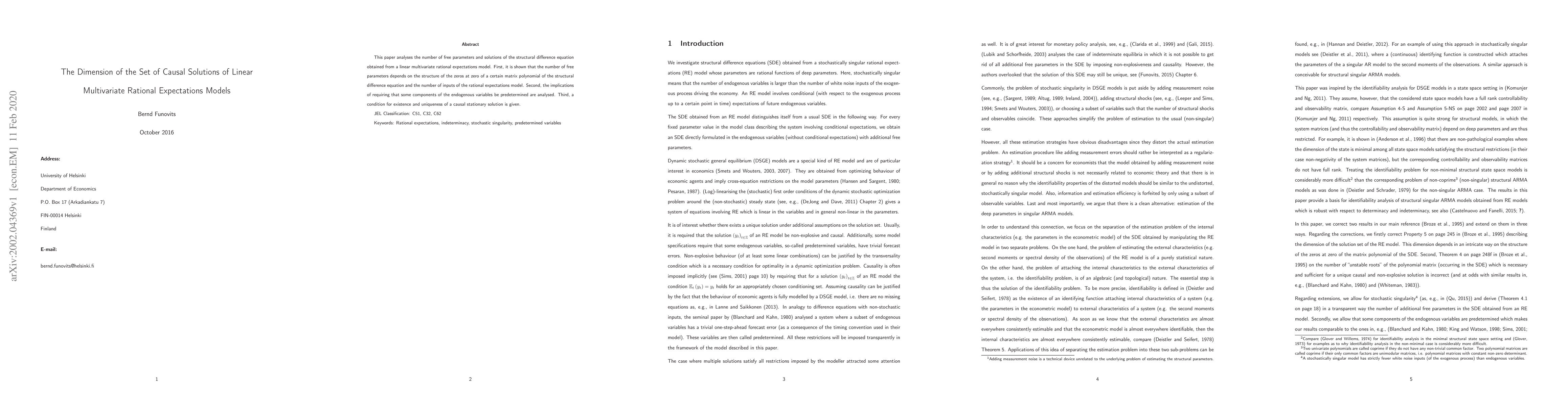 This paper investigates the number of free parameters and solutions in linear multivariate rational expectations models, showing that it depends on the zeros of a matrix polynomial and the number of inputs. It also examines the implications of predetermined components and provides a condition for the existence and uniqueness of a causal stationary solution.
