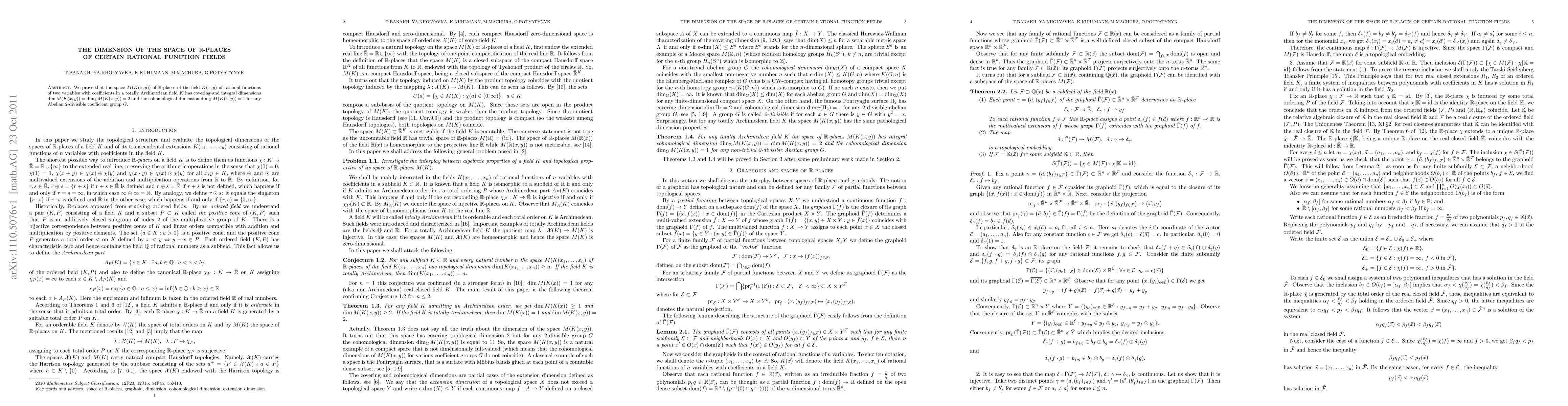 Researchers prove that the space of R-places in a rational function field has dimensions 2 for covering and integral dimensions, and 1 for cohomological dimension.