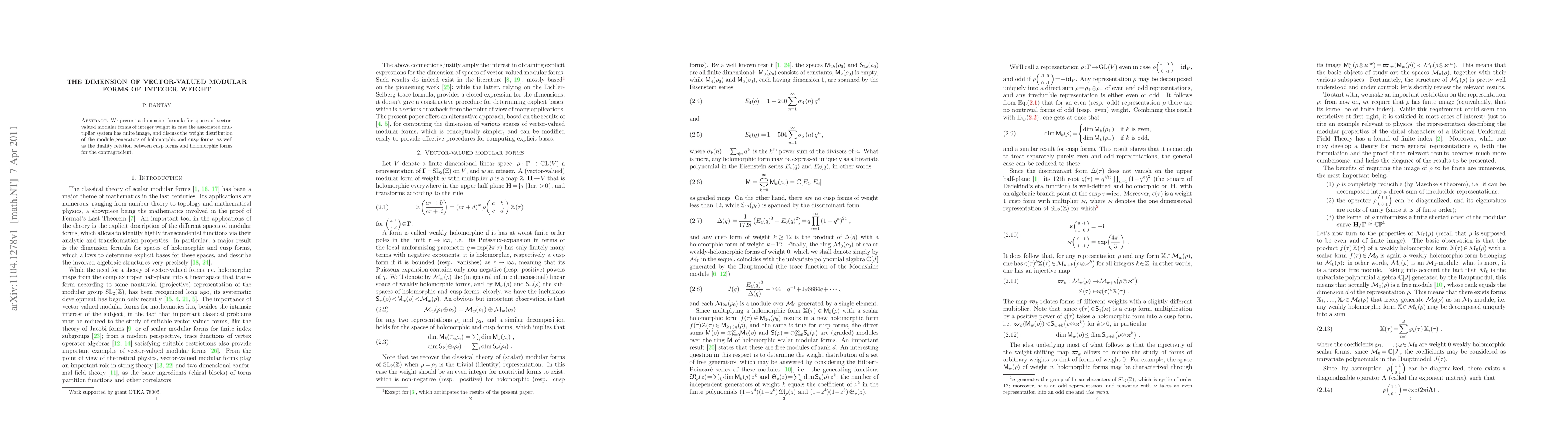 This paper provides a dimension formula for vector-valued modular forms of integer weight with finite image multiplier systems and explores the weight distribution of module generators for holomorphic and cusp forms, along with their duality relation.