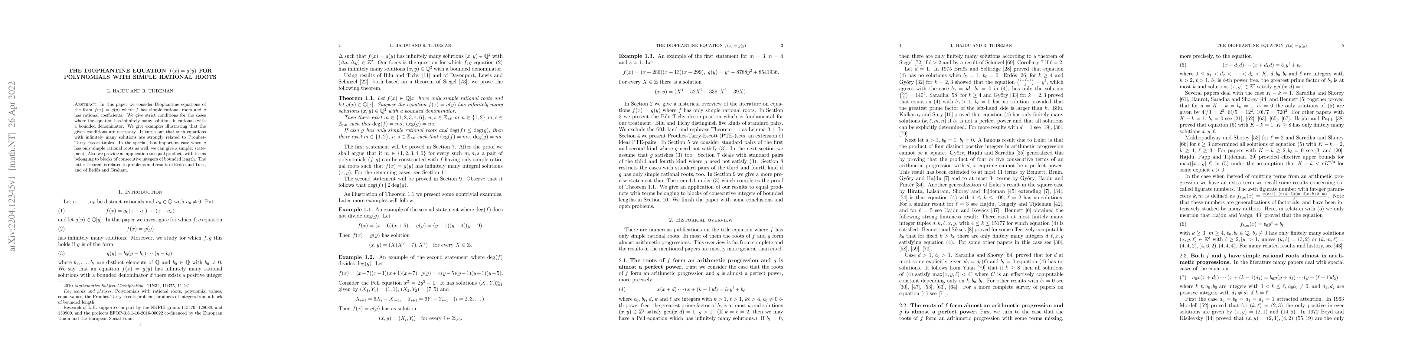 This paper investigates Diophantine equations where one polynomial has simple rational roots and the other has rational coefficients, finding conditions for infinitely many solutions with bounded denominators. It also provides applications to equal products of consecutive integers.