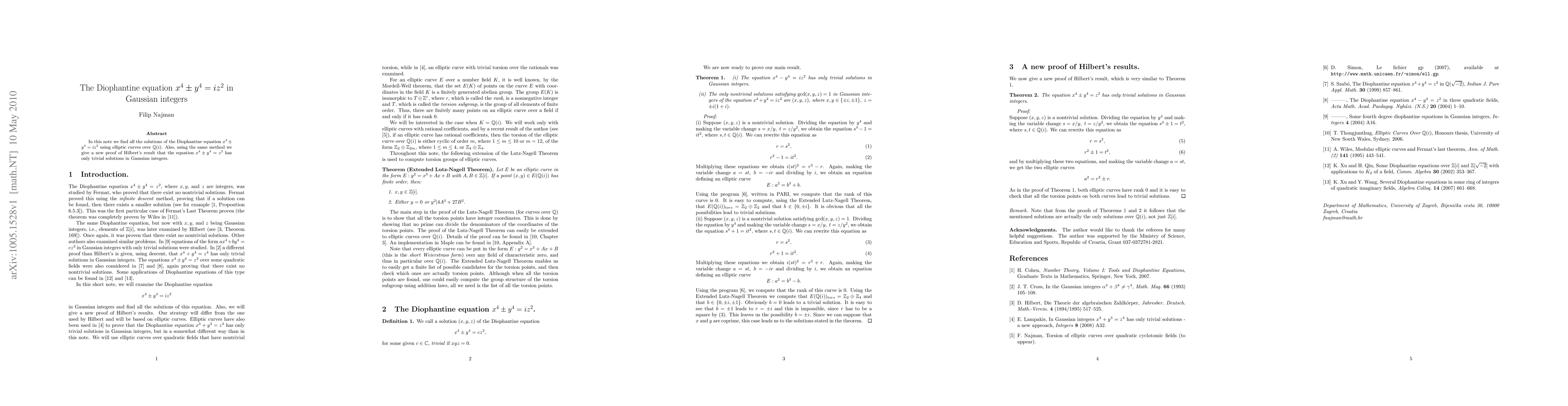 The research provides a new proof of Hilbert's result and a method for solving the Diophantine equation using elliptic curves over Q(i)