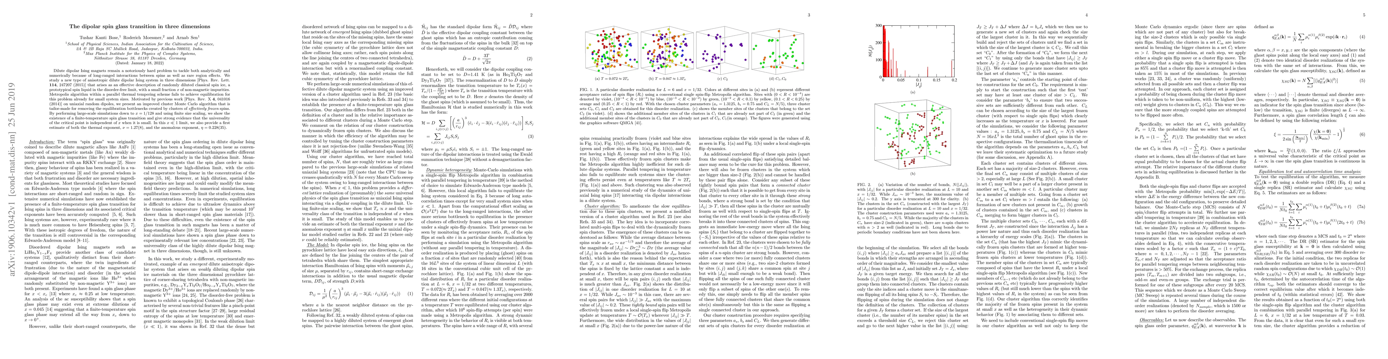 This paper investigates the spin glass transition in three-dimensional dilute dipolar Ising magnets, employing an improved cluster Monte Carlo algorithm to overcome equilibration issues. The study reveals a finite-temperature spin glass transition and provides estimates for the thermal and anomalous exponents, indicating universality independent of impurity concentration when small.