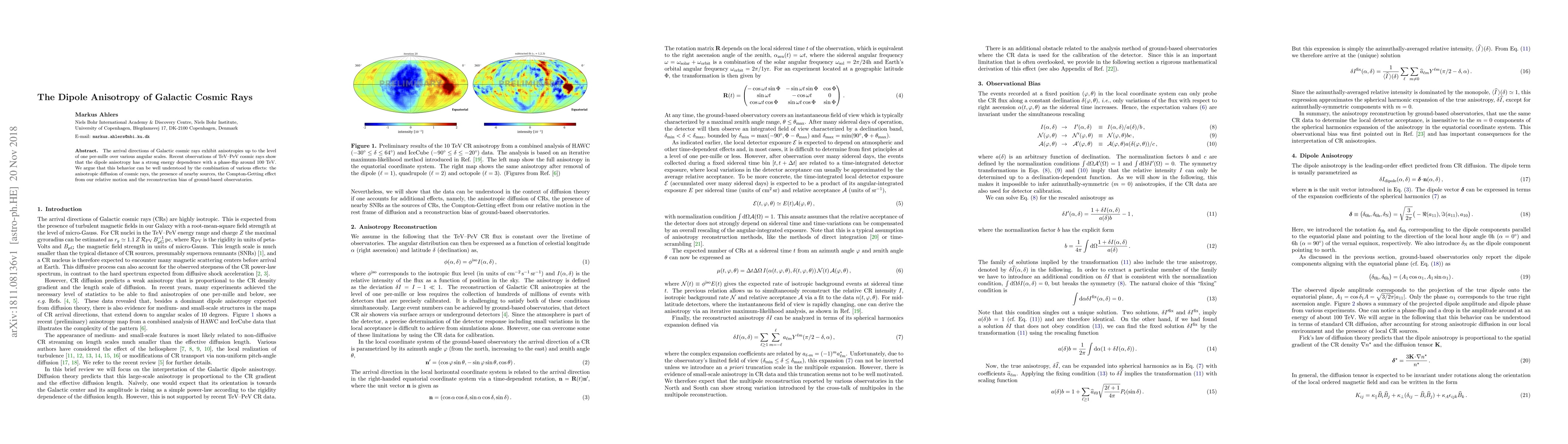Summary: The study reveals that Galactic cosmic rays exhibit dipole anisotropy with strong energy dependence, particularly a phase-flip around 100 TeV, which can be explained by the combined effects of anisotropic diffusion, nearby cosmic ray sources, the Compton-Getting effect, and observational biases from ground-based detectors.