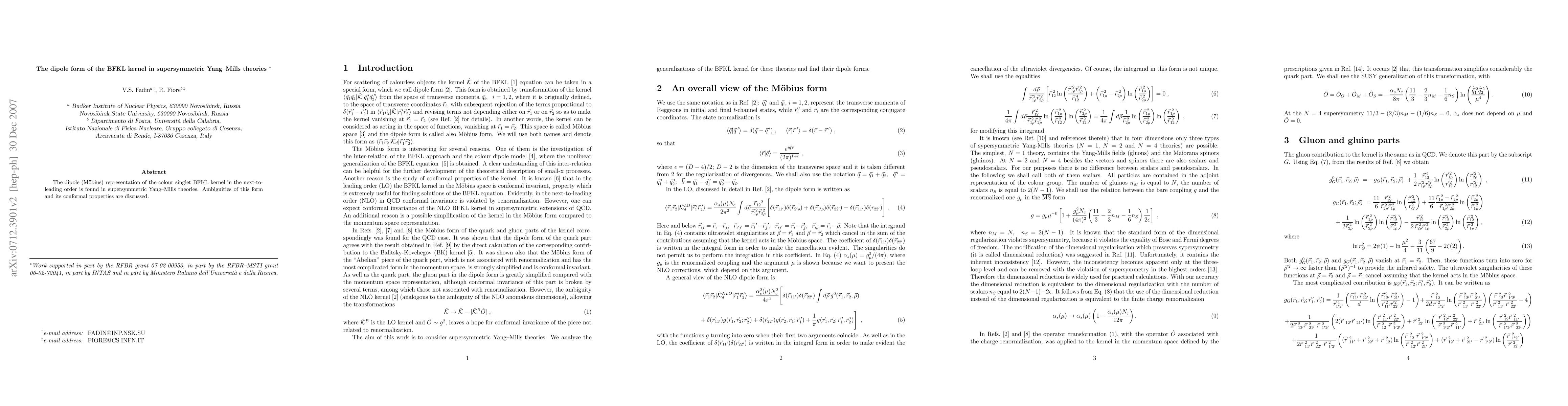 The dipole (M\"{o}bius) representation of the colour singlet BFKL kernel in the next-to-leading order is found in supersymmetric Yang--Mills theories. Ambiguities of this form and its conformal properties are discussed.