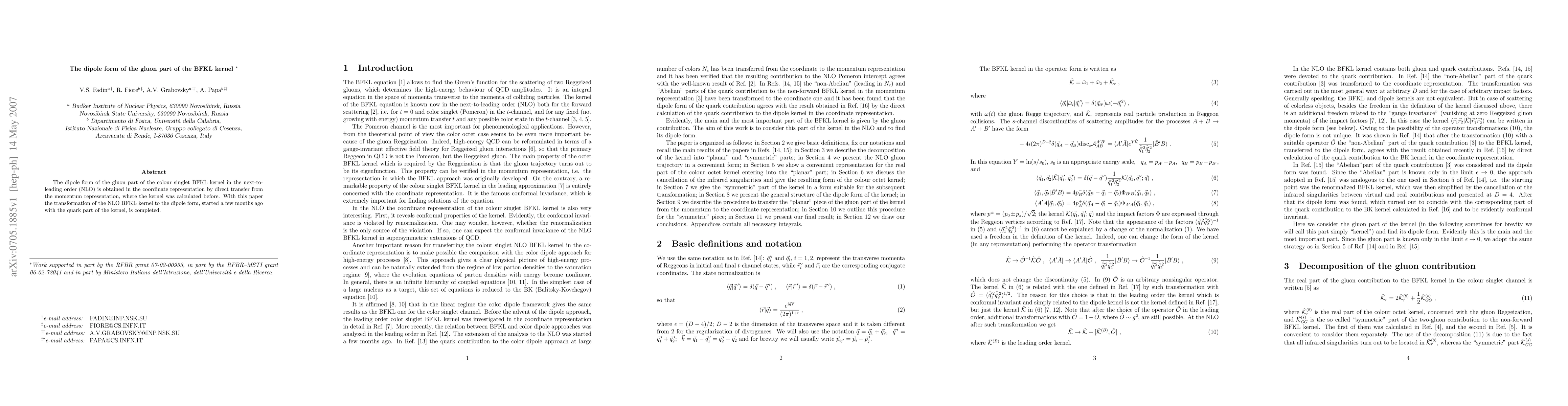 This paper derives the dipole form of the gluon part of the next-to-leading order BFKL kernel in the coordinate representation, completing the transformation from the momentum representation that was previously done for the quark part. This transformation aids in understanding the dynamics of gluon interactions in high-energy physics.