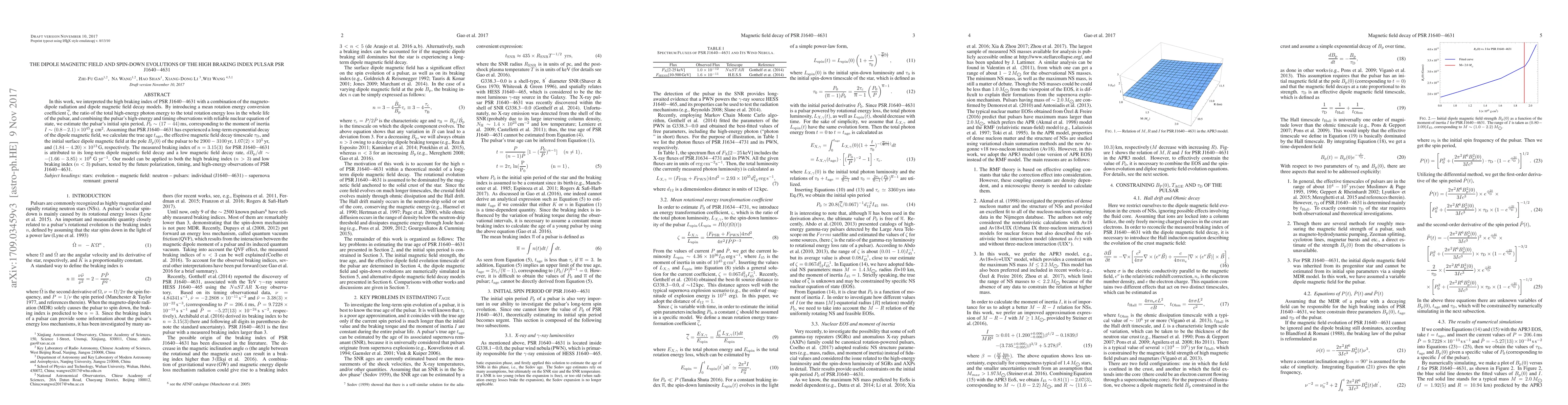 This paper interprets the high braking index of pulsar PSR J1640-4631 using magneto-dipole radiation and dipole magnetic field decay models, estimating its initial spin period and magnetic field characteristics. The model attributes the high braking index to long-term magnetic field decay and predicts parameters like the pulsar's age and magnetic field strength.