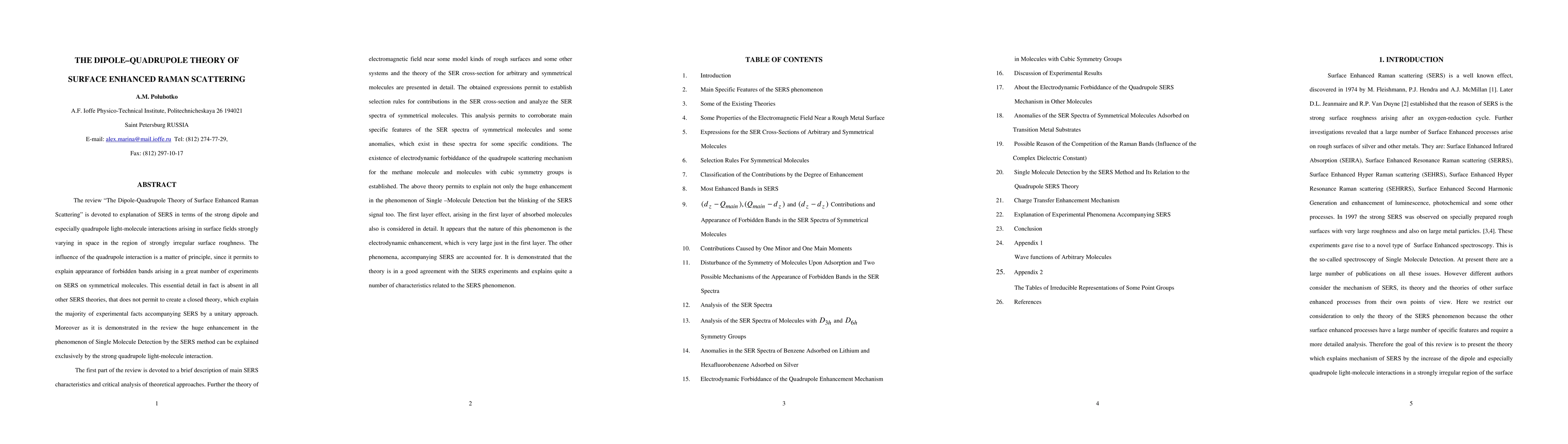 The review is devoted to explanation of SERS in terms of the dipole and quadrupole light-molecule interactions arising in surface fields strongly varying in space in the region of the strongly irregular surface roughness. The main SERS characteristics, the theory of electromagnetic fields near some model kinds of rough surfaces and some other systems, the theory of SERS Raman tensor for arbitrary and symmetrical molecules, selection rules and analysis of the SER spectra, some anomalies in the SER spectra of symmetrical molecules for some specific conditions, electrodynamic forbiddance of the quadrupole scattering mechanism for the methane molecule and molecules with cubic symmetry groups are considered. The huge enhancement and blinking of the SERS signal arising in the phenomenon of Single Molecule detection by the SERS method are explained. The above theory is compared with some another SERS mechanisms, and the phenomena accompanying SERS are accounted for. It is demonstrated that the theory is in a good agreement with the experiment and explains quite a number of characteristics related to the SERS phenomenon.