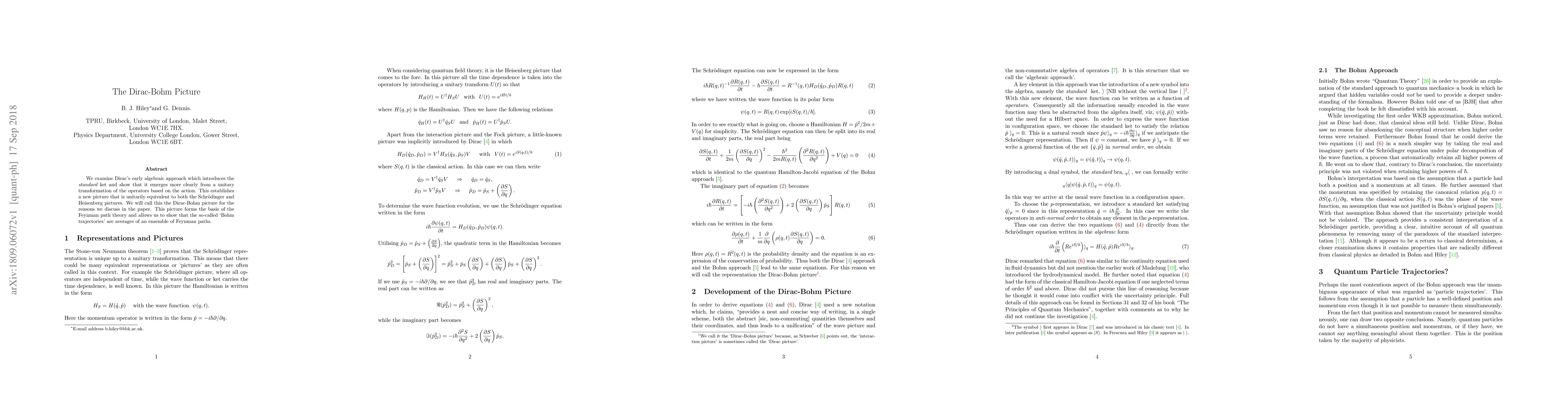We examine Dirac's early algebraic approach which introduces the {\em standard} ket and show that it emerges more clearly from a unitary transformation of the operators based on the action. This establishes a new picture that is unitarily equivalent to both the Schr\"{o}dinger and Heisenberg pictures. We will call this the Dirac-Bohm picture for the reasons we discuss in the paper. This picture forms the basis of the Feynman path theory and allows us to show that the so-called `Bohm trajectories' are averages of an ensemble of Feynman paths.