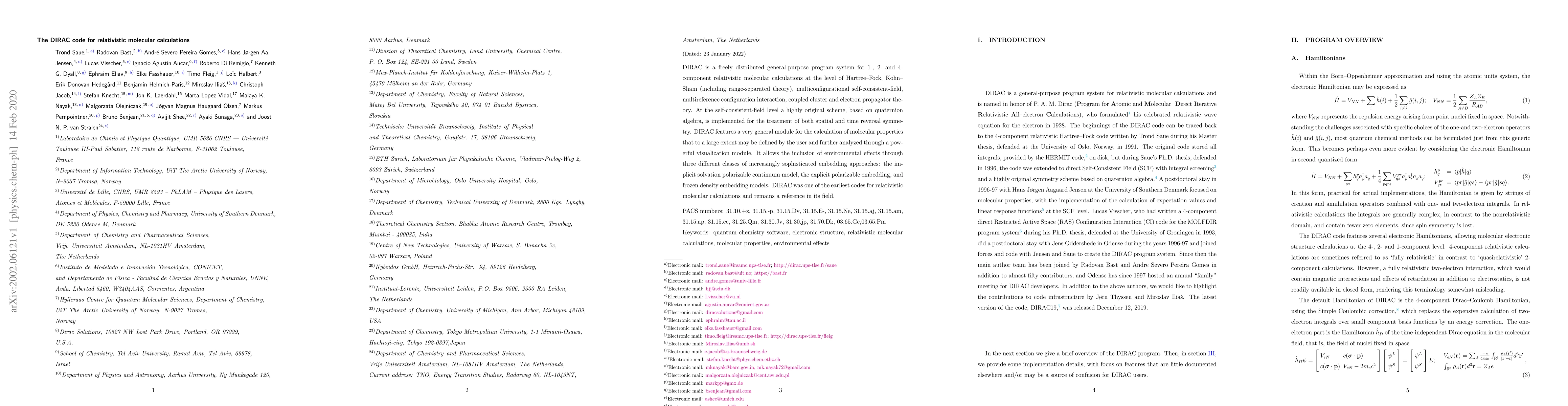 DIRAC is a comprehensive, freely available software for relativistic molecular calculations, supporting various methods including Hartree-Fock and coupled cluster theory. It uniquely employs quaternion algebra for symmetry treatment and offers advanced embedding models for environmental effects.