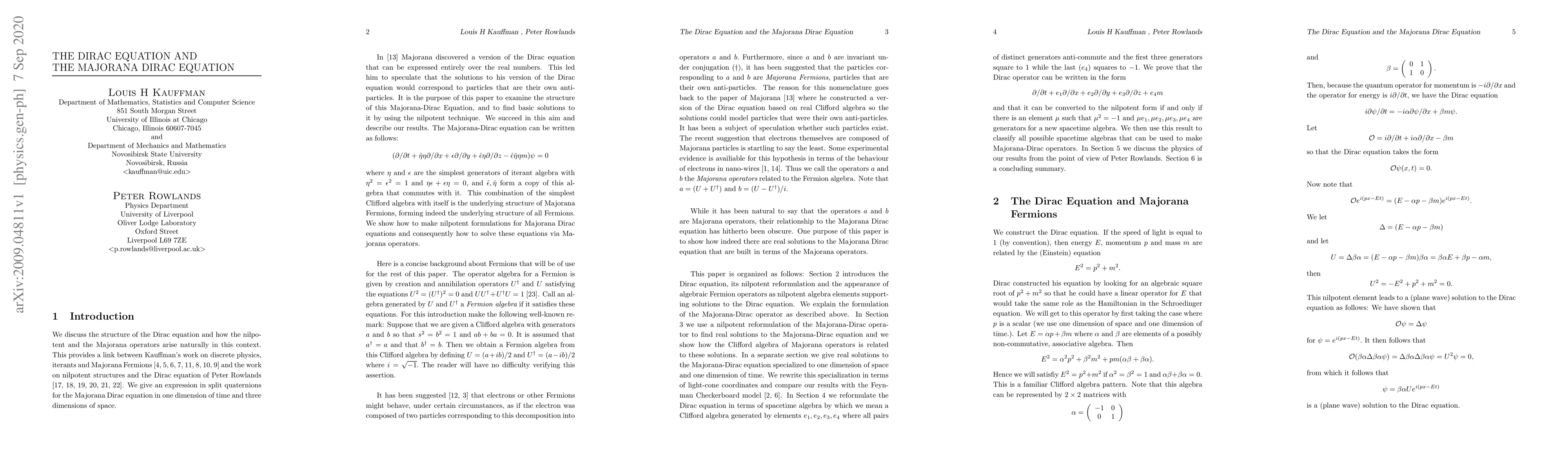 We discuss the structure of the Dirac equation and how the nilpotent and the Majorana operators arise naturally in this context. This provides a link between Kauffman's work on discrete physics, iterants and Majorana Fermions and the work on nilpotent structures and the Dirac equation of Peter Rowlands. We give an expression in split quaternions for the Majorana Dirac equation in one dimension of time and three dimensions of space. Majorana discovered a version of the Dirac equation that can be expressed entirely over the real numbers. This led him to speculate that the solutions to his version of the Dirac equation would correspond to particles that are their own anti-particles. It is the purpose of this paper to examine the structure of this Majorana-Dirac Equation, and to find basic solutions to it by using the nilpotent technique. We succeed in this aim and describe our results.