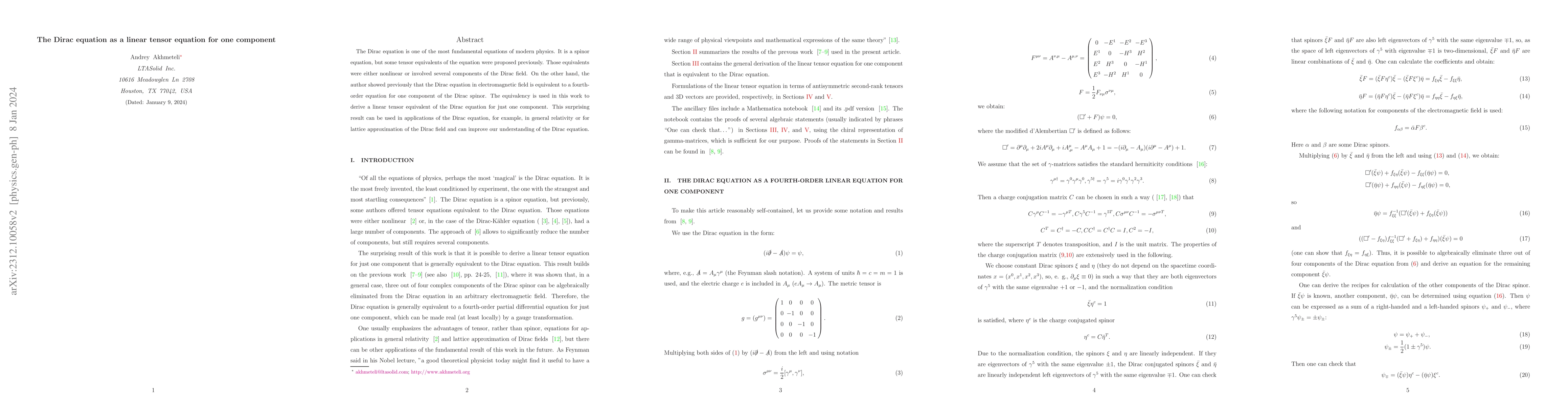The Dirac equation is one of the most fundamental equations of modern physics. It is a spinor equation, but some tensor equivalents of the equation were proposed previously. Those equivalents were either nonlinear or involved several components of the Dirac field. On the other hand, the author showed previously that the Dirac equation in electromagnetic field is equivalent to a fourth-order equation for one component of the Dirac spinor. The equivalency is used in this work to derive a linear tensor equivalent of the Dirac equation for just one component. This surprising result can be used in applications of the Dirac equation, for example, in general relativity or for lattice approximation of the Dirac field and can improve our understanding of the Dirac equation.