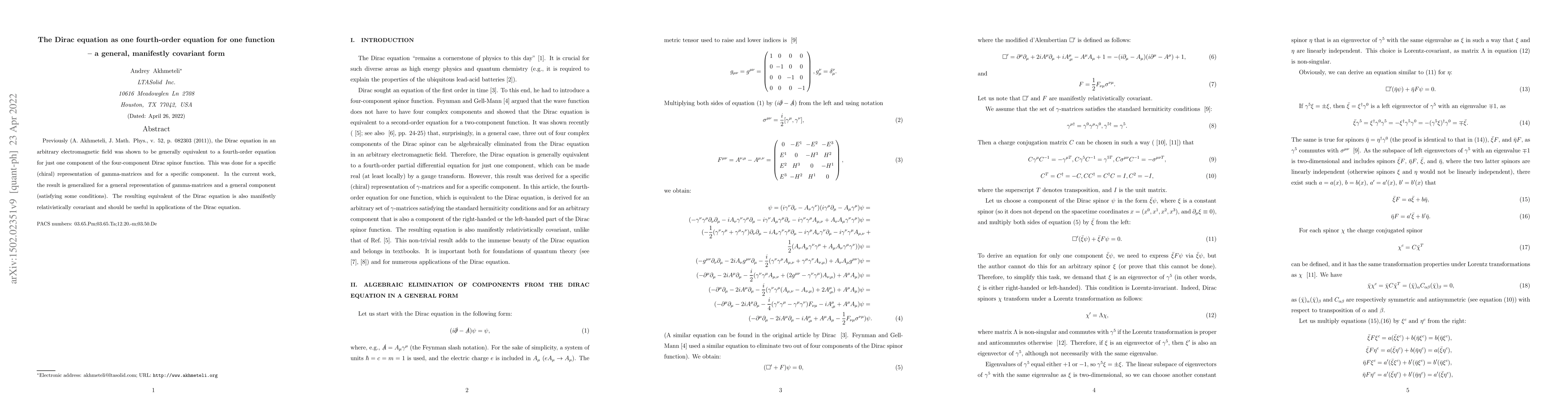 Previously (A. Akhmeteli, J. Math. Phys., v. 52, p. 082303 (2011)), the Dirac equation in an arbitrary electromagnetic field was shown to be generally equivalent to a fourth-order equation for just one component of the four-component Dirac spinor function. This was done for a specific (chiral) representation of gamma-matrices and for a specific component. In the current work, the result is generalized for a general representation of gamma-matrices and a general component (satisfying some conditions). The resulting equivalent of the Dirac equation is also manifestly relativistically covariant and should be useful in applications of the Dirac equation.