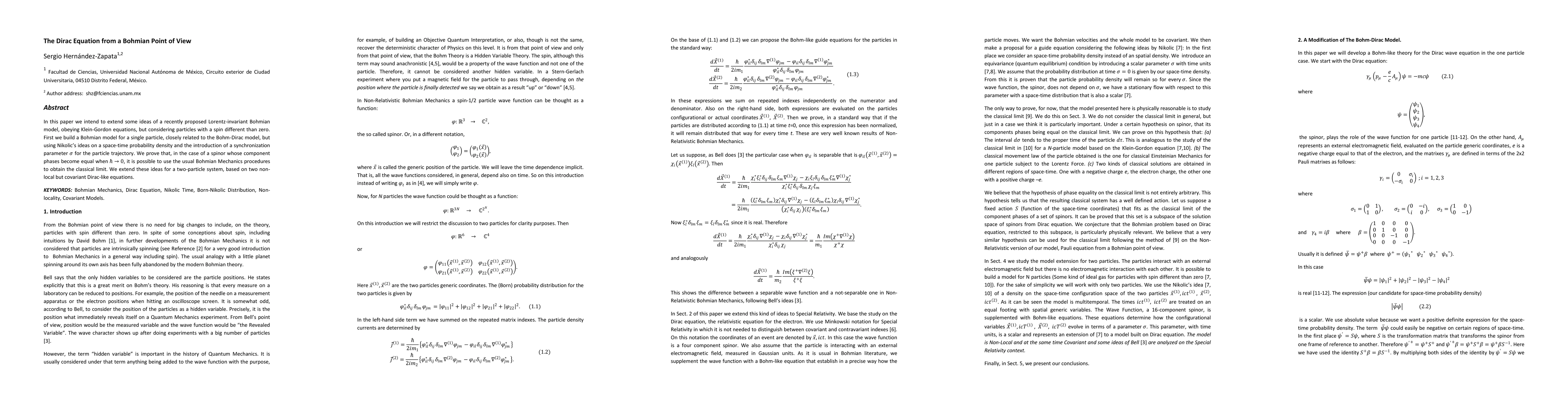 In this paper we intend to extend some ideas of a recently proposed Lorentz-invariant Bohmian model, obeying Klein-Gordon equations, but considering particles with a spin different than zero. First we build a Bohmian model for a single particle, closely related to the Bohm-Dirac model, but using Nikolic's ideas on a space-time probability density and the introduction of a synchronization parameter \sigma for the particle trajectory. We prove that, in the case of a spinor whose component phases become equal when \plank \to 0, it is possible to use the usual Bohmian Mechanics procedures to obtain the classical limit. We extend these ideas for a two-particle system, based on two non-local but covariant Dirac-like equations.