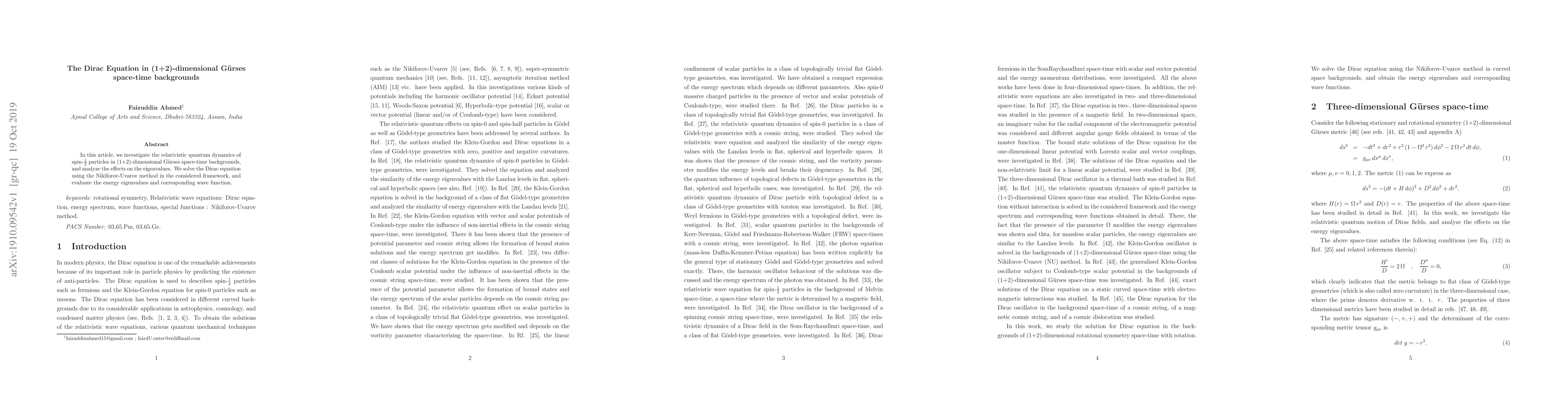 This paper studies the relativistic quantum dynamics of spin-$\frac{1}{2}$ particles in (1+2)-dimensional G{\"u}rses space-time, solving the Dirac equation with the Nikiforov-Uvarov method to determine energy eigenvalues and wave functions.