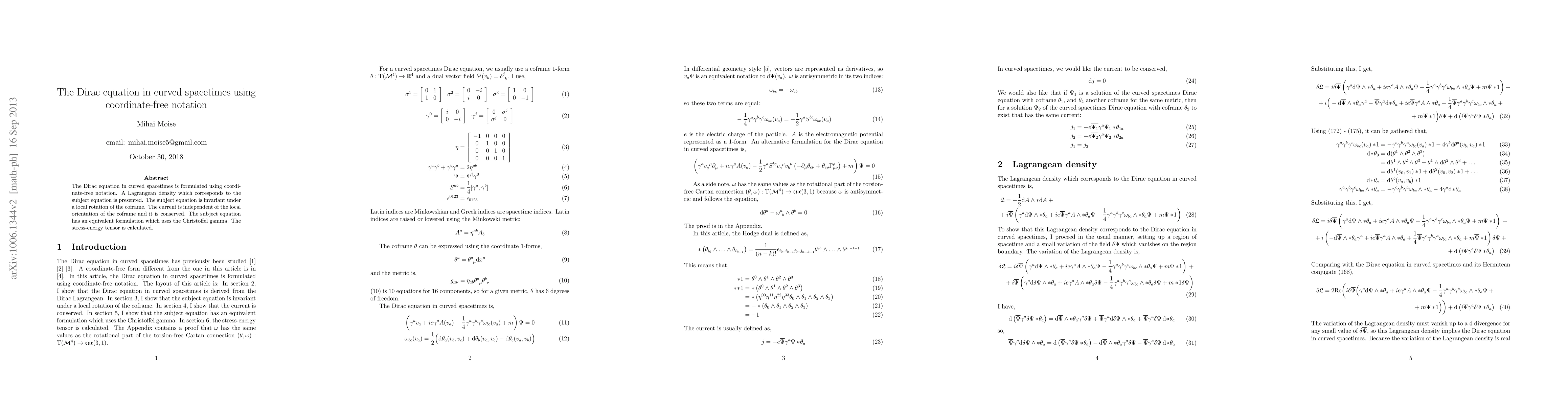 This paper formulates the Dirac equation in curved spacetime using coordinate-free notation, presenting a Lagrangean density and demonstrating invariance under local rotations. It also calculates the stress-energy tensor and shows the equation's equivalence using the Christoffel gamma.
