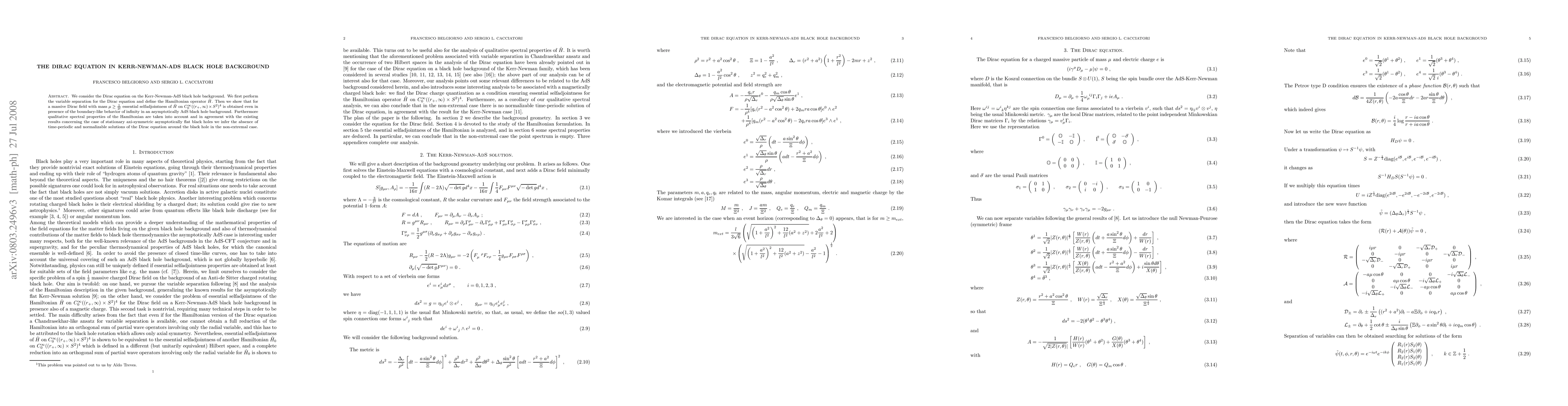 We consider the Dirac equation on the Kerr-Newman-AdS black hole background. We first perform the variable separation for the Dirac equation and define the Hamiltonian operator $\hat H$. Then we show that for a massive Dirac field with mass $\mu\geq \frac{1}{2l}$ essential selfadjointness of $\hat H$ on $C_0^{\infty} ((r_+,\infty) \times S^2)^4$ is obtained even in presence of the boundary-like behavior of infinity in an asymptotically AdS black hole background. Furthermore qualitative spectral properties of the Hamiltonian are taken into account and in agreement with the existing results concerning the case of stationary axi-symmetric asymptotically flat black holes we infer the absence of time-periodic and normalizable solutions of the Dirac equation around the black hole in the non-extremal case.